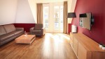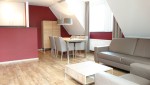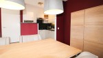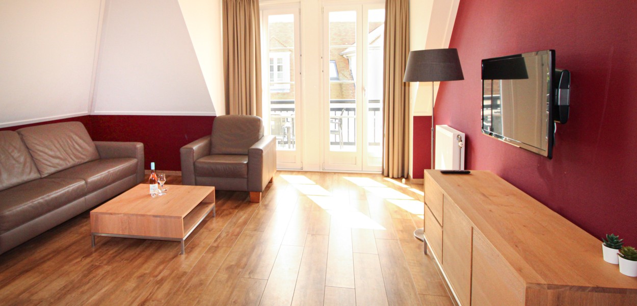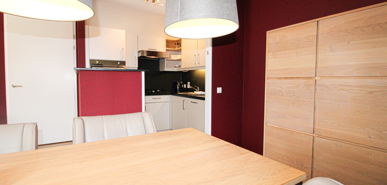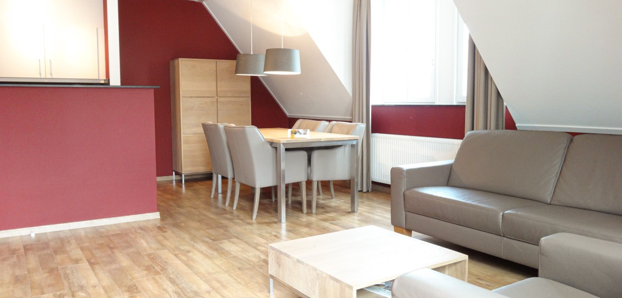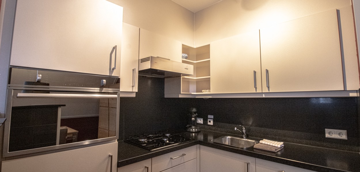 De compleet ingerichte open keuken is voorzien van een Senseo-machine, combimagnetron, koel-vriescombinatie en afwasmachine. Aan de eettafel eet u in luxe eetkamerstoelen en in de aansluitende woonkamer kunt u ontspannen in één van de comfortabele zetels. De combinatie van inrichting en kleurgebruik geeft dit appartement een geheel eigen, romantische sfeer.