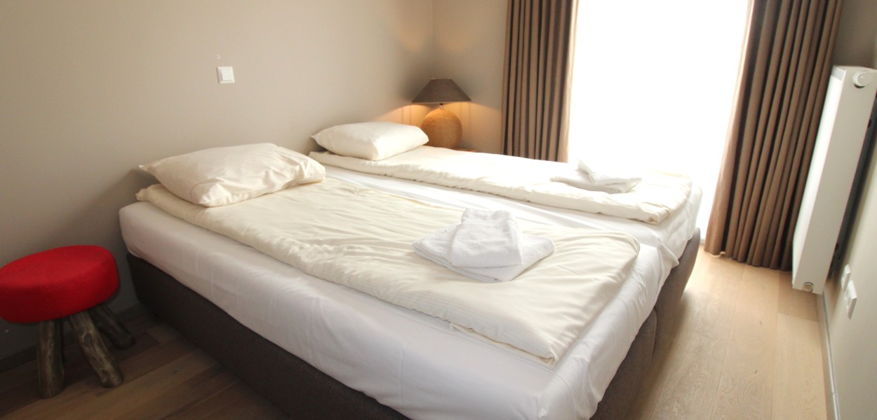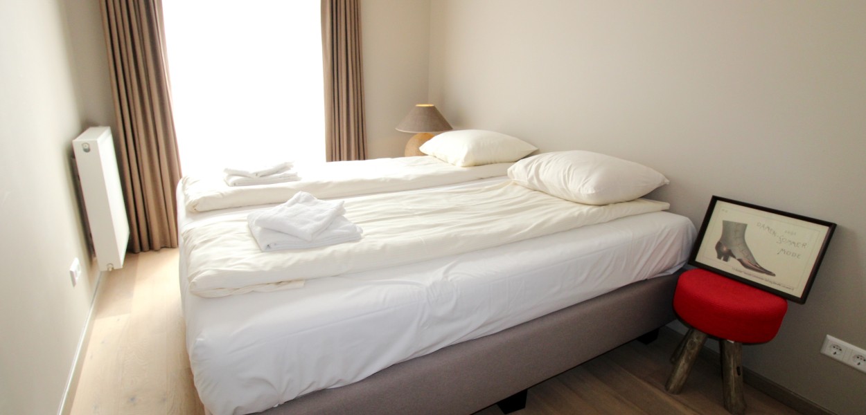 De beide slaapkamers zijn ingericht met luxe boxspringcombinaties en extra kastruimte. Daarnaast is in de Masterbedroom tevens een televisie aanwezig. In de badkamer vindt u een ligbad met douche en een aparte inloopdouche. Ook is er een dubbele wastafel aanwezig. Een individueel toilet bevindt zich in de hal evenals een praktische berging met wasmachine en droger.