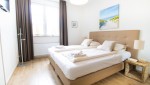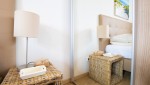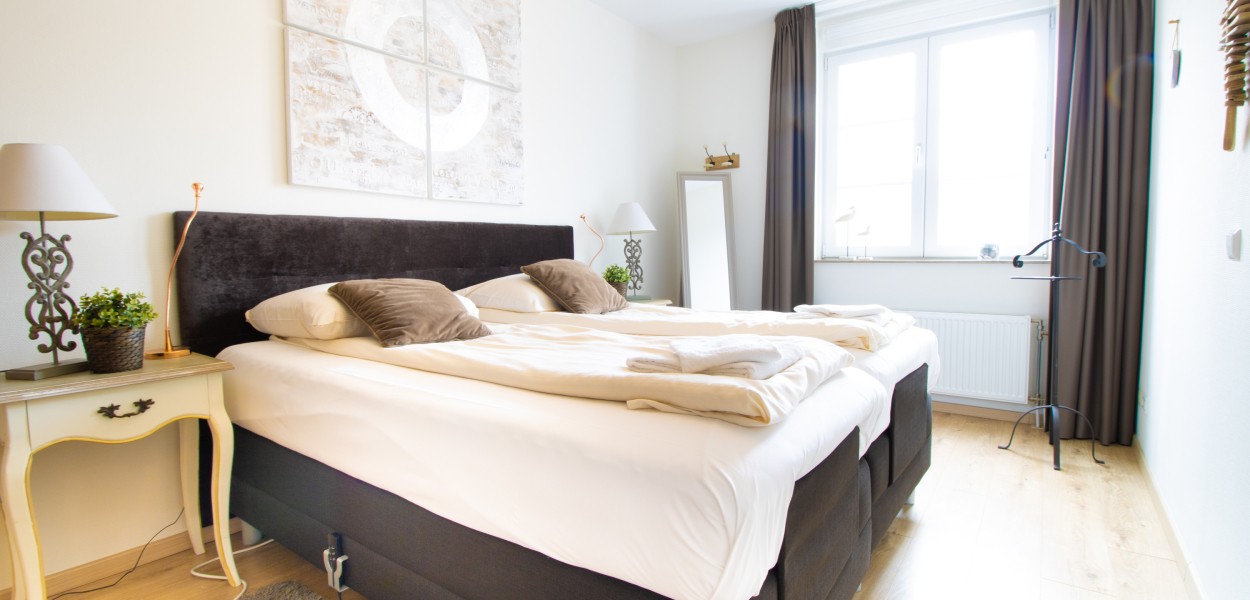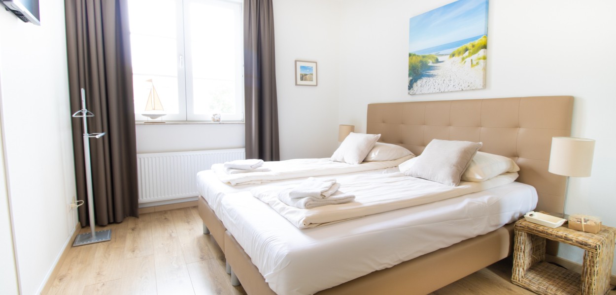 In de ruime masterbedroom staat een luxe boxspringcombinatie met elektrisch verstelbare bodem, voor optimaal comfort. Ook is er in de masterbedroom een televisie voorzien. In de tweede slaapkamer staat eveneens een boxspringcombinatie en is er een extra TV. In de comfortabele badkamer vindt u een inloopdouche en een dubbele wastafel. Een apart toilet bevindt zich in de hal. Het appartement heeft ook een praktische berging waar u ondere andere een wasmachine en droger tot uw beschikking heeft. Voor uw gemak zijn alle ramen in deze woning voorzien van horren.