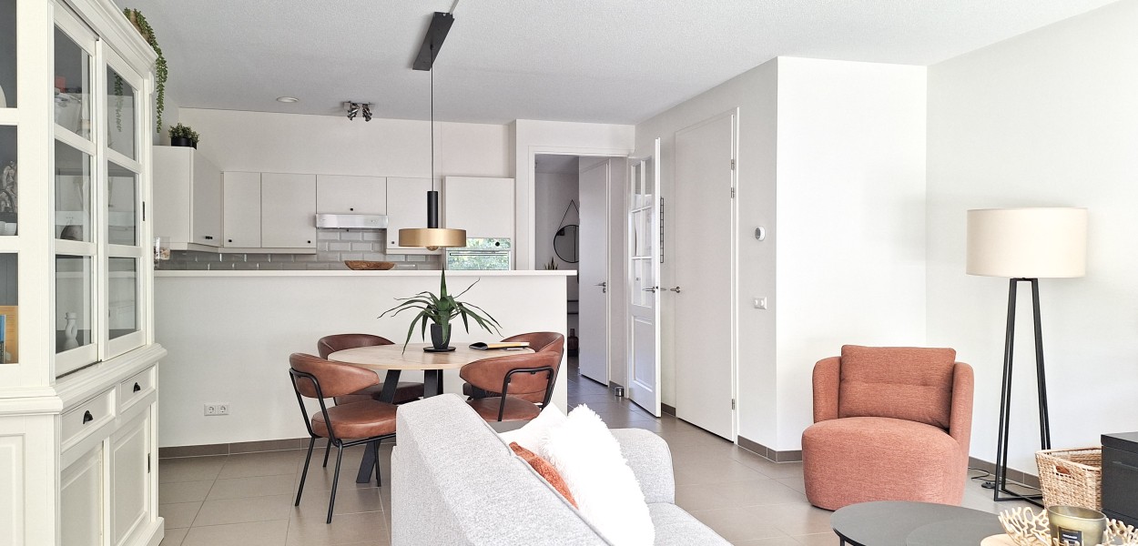 De luxe open keuken is voorzien van een combimagnetron, koel-vriescombinatie en een afwasmachine. Ook staat er een slow juicer tot uw beschikking. Verder is er behalve een Nespresso-apparaat ook een Senseo-apparaat en een snelfilterapparaat in deze woning voorhanden. De combinatie van de huiselijke woonkamer, met Smart TV (incl. basis pakket) ruime, open keuken en schuifpui naar het zonnige balkon, geeft veel leefcomfort aan deze woning.