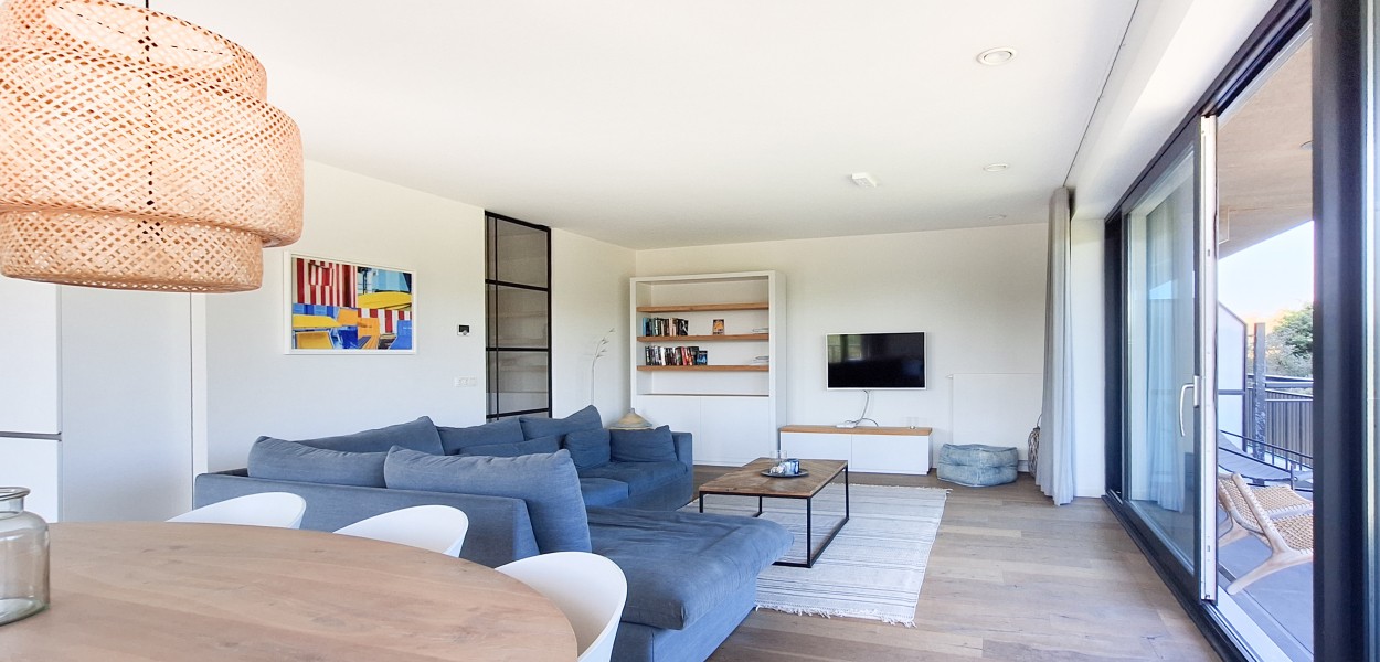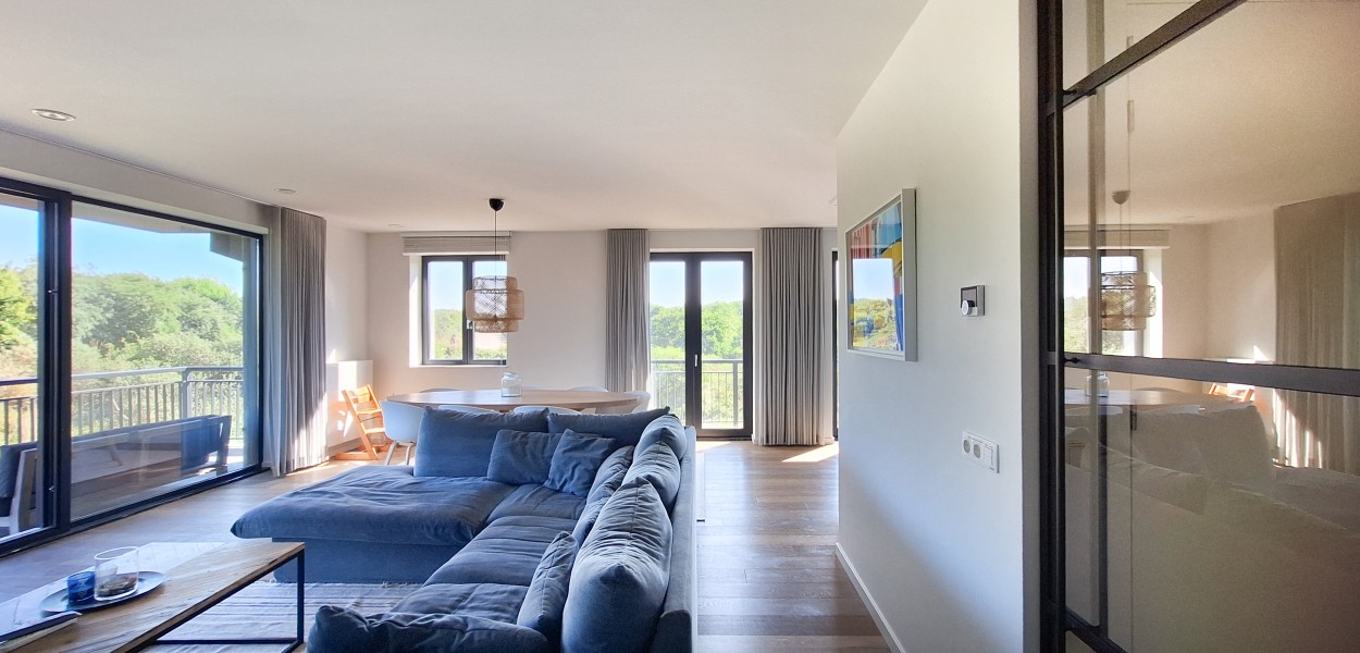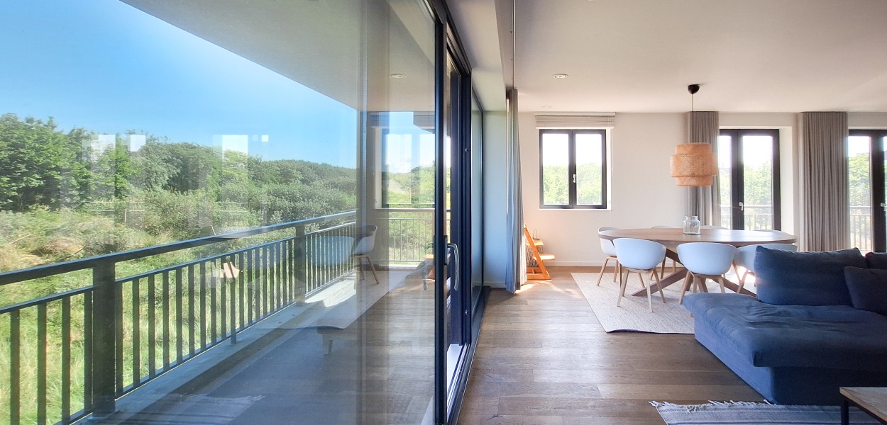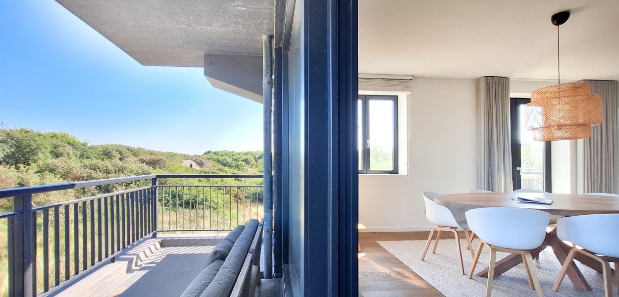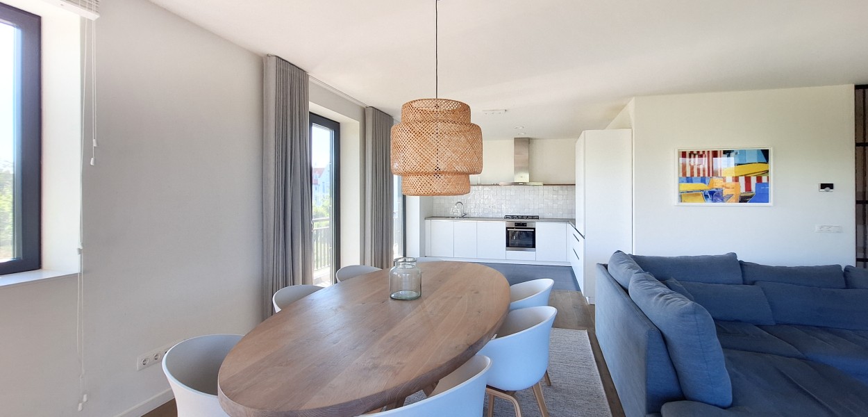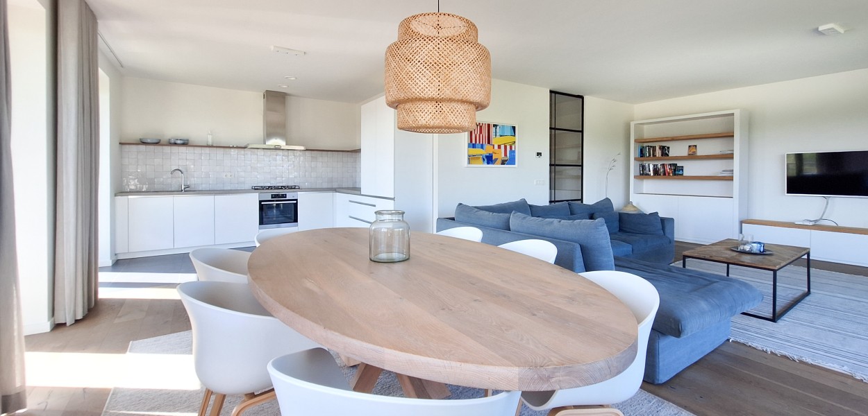 De ligging van het appartement is werkelijk middenin de natuur en u geniet meteen bij binnenkomst van het heerlijk rustgevende gevoel. De woonkamer is heerlijk licht dankzij de grote raampartijen op het noorden én het oosten met uitzicht op de prachtige Cadzandse duinen. Er is een ruime zithoek met een comfortabele hoekbank waar u televisie kunt kijken of rustig een boek kunt lezen. De stijlvolle ovale eettafel biedt voldoende ruimte voor een gezellige maaltijd samen of een gezelschapsspelletje. De open keuken is van alle gemakken voorzien; de keuken beschikt onder andere over een Nespresso-machine, gasfornuis met 5-pitten, een praktische oven, koelkast, vriesgedeelte met 3 lades en een vaatwasmachine.