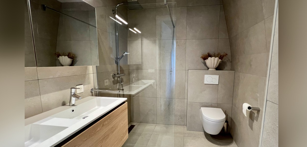 De beide slaapkamers zijn elegant ingericht met luxe boxspringcombinaties en televisie en beschikken over voldoende opbergruimte. De luxe badkamer beschikt over een regendouche, een dubbele wastafel en een toilet, een individueel toilet bevindt zich in de hal. In de berging staat onder andere een wasmachine en een droger tot uw beschikking.