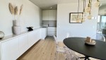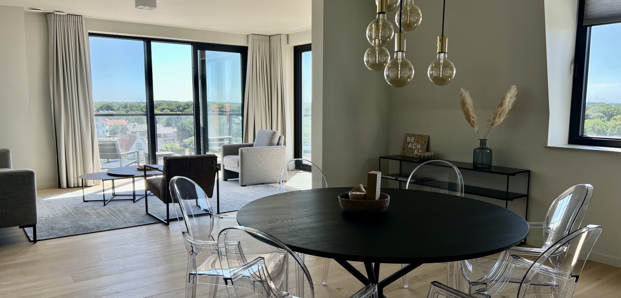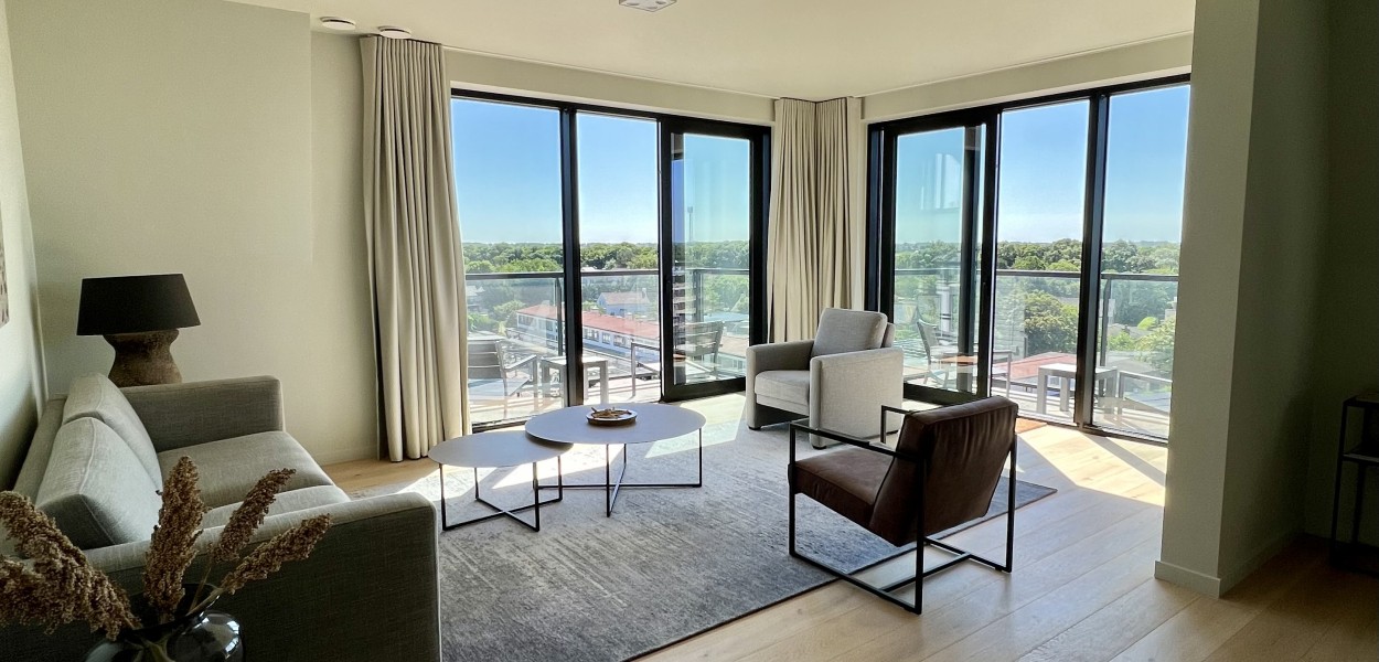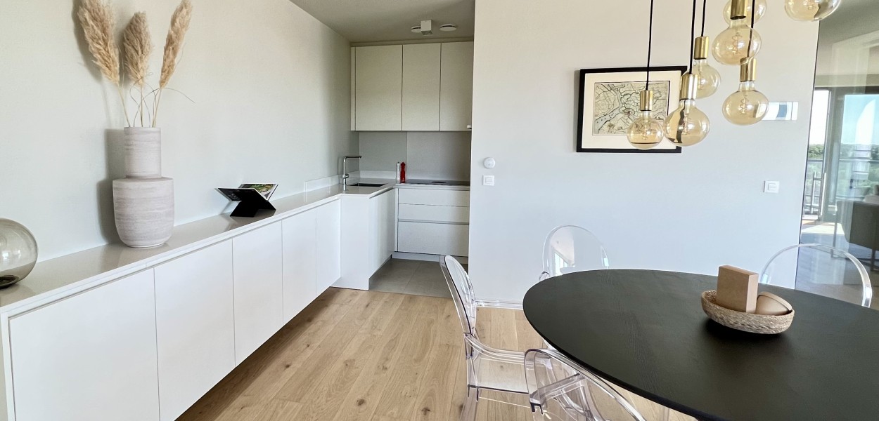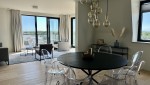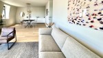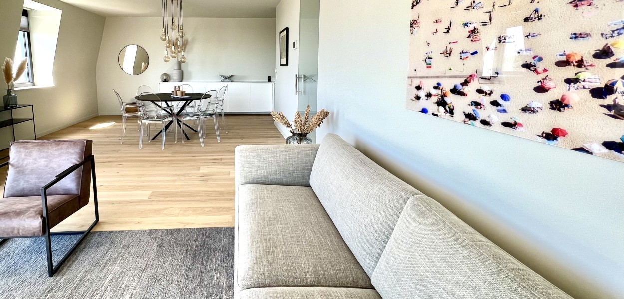 De woonkamer is voorzien van een comfortabel zitgedeelte met televisie en hoge tuindeuren die openen naar het zonnige balkon. Het zitgedeelte omvat een heerlijke zitbank en 2 losse zetels. De multimedia als televisie met standaard zenderpakket en Sonos-systeem staan volledig tot uw beschikking. Er is een eetgedeelte met een ovale tafel met 6 stoelen die de open ruimte met de keuken verbindt. De keuken is voorzien van een Nespresso-machine, inductiekookplaat met geïntegreerde Bora-afzuiginstallatie, een combimagnetron, een koelkast met vriesvak en een vaatwasser.