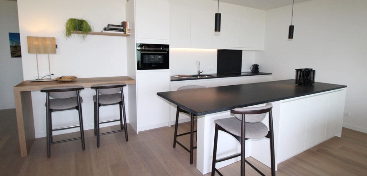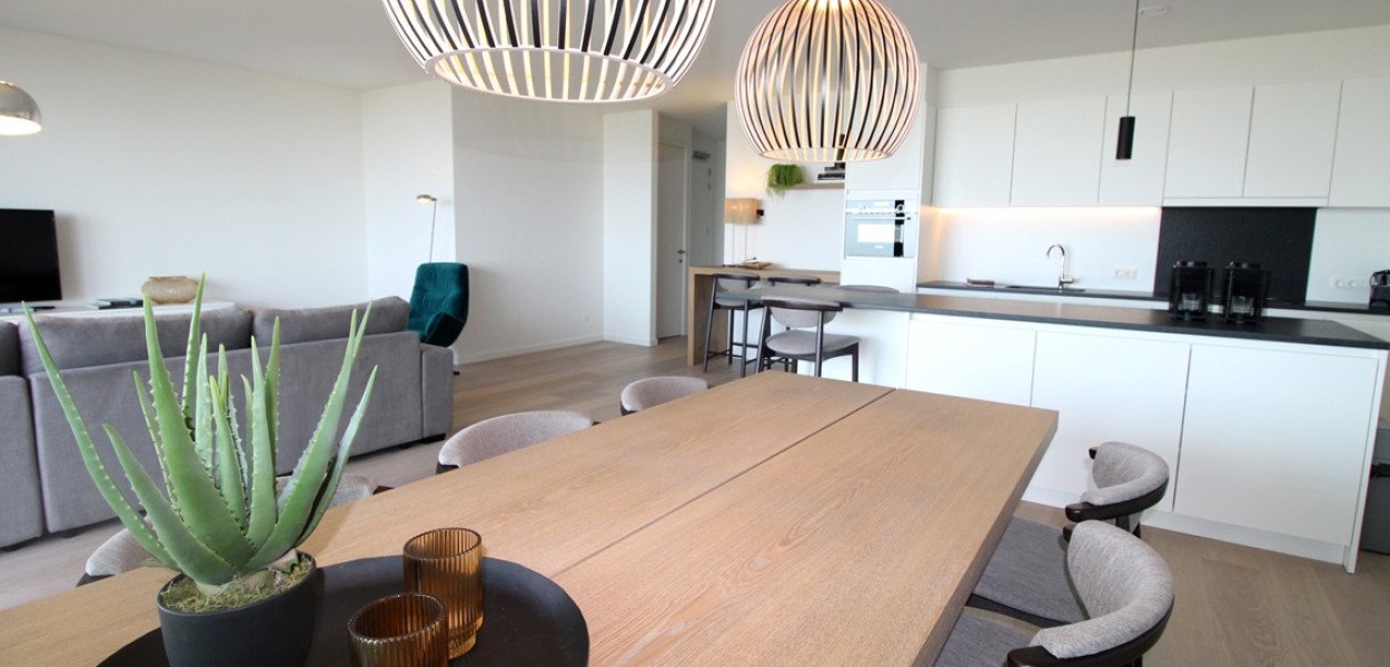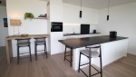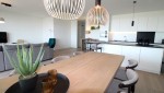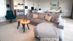 Het leefgedeelte is ruim opgezet en mooi op elkaar afgestemd, dankzij het houten parket doorheen de hele woning, lopen alle ruimtes naadloos én drempelloos in elkaar over. Aan de rechterzijde is een comfortabele zithoek met televisie. De schuifpui beslaat de hele noordzijde waardoor u zich midden in de duinen waant en ook heerlijk veel licht binnen heeft. Het steeds wisselende schouwspel op het strand en op zee verveelt nooit. De grote eettafel verbindt de ruimte met de luxe open keuken met spoeleiland welke beschikt over een Nespresso-machine, inductiekookplaat, een combimagnetron, een koel-vriescombinatie en een afwasmachine.