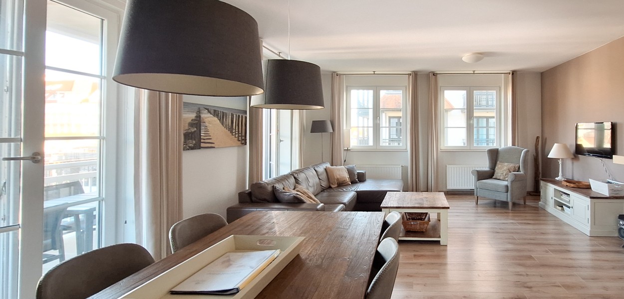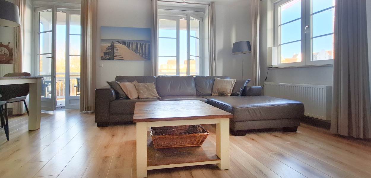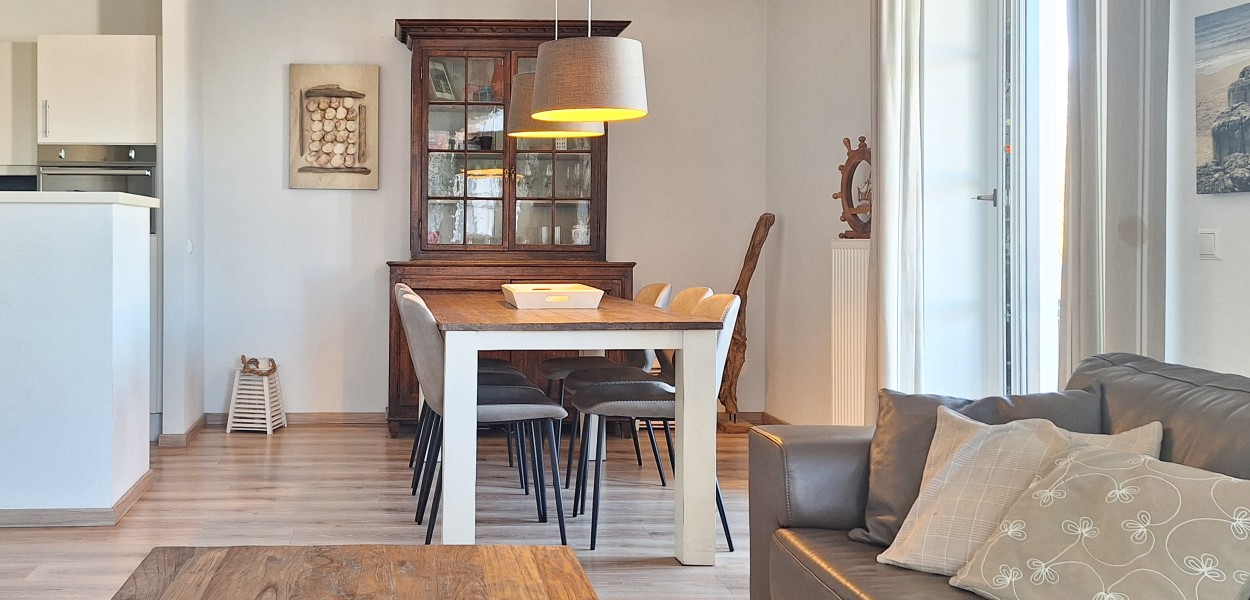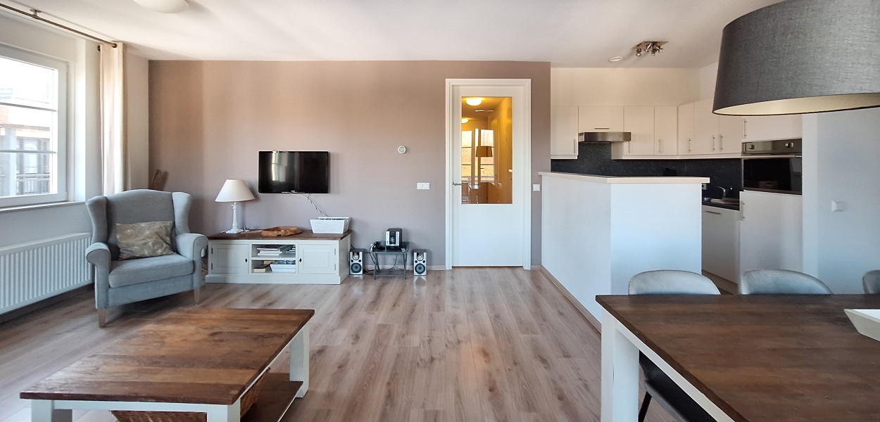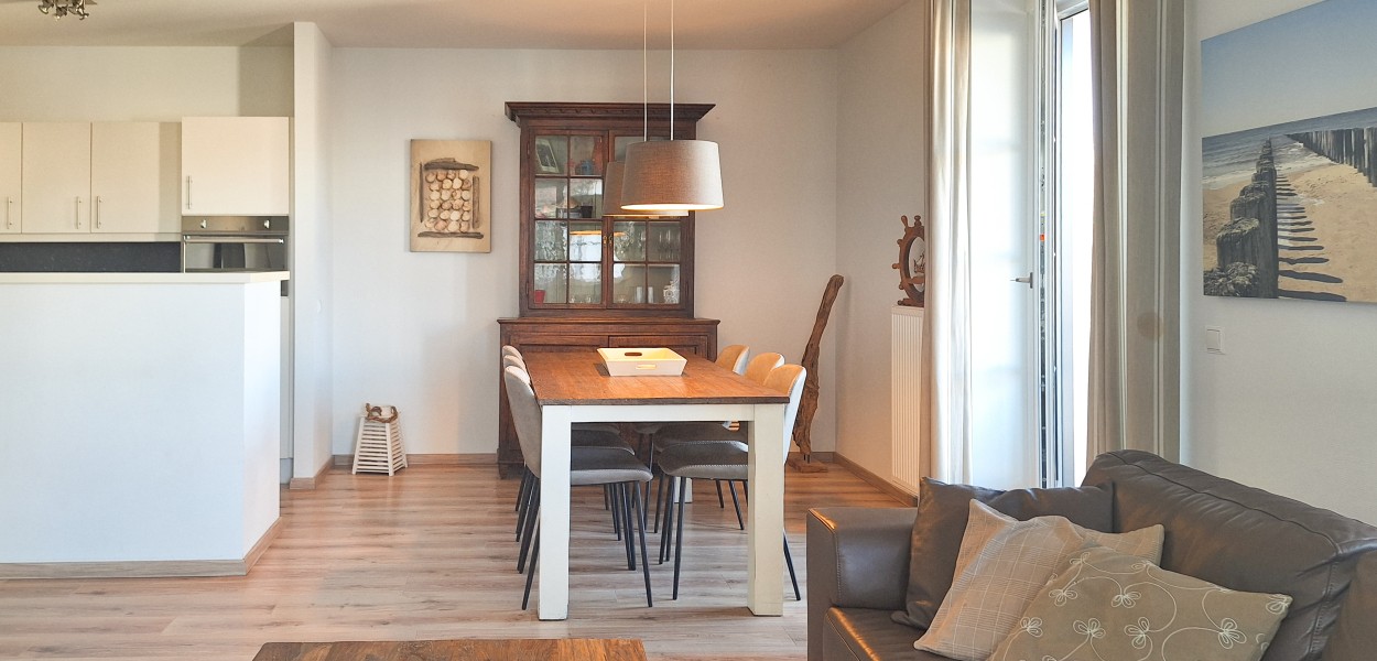 De luxe open keuken is voorzien van een Senseo machine, combimagnetron, koel-vriescombinatie en een afwasmachine. De grote eettafel verbindt de keuken met de comfortabele woonkamer met TV (incl.basis pakket) waar u van veel licht profiteert door de vele ramen. Alles bij elkaar is dit zes-persoons appartement een perfecte uitvalsbasis voor uw vakantie in Cadzand.