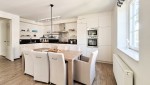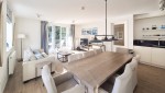 De woonkamer is heerlijk licht en is gezellig ingericht met een comfortabele zetel, een televisie en een stereo-set. De grote eettafel biedt meer dan voldoende ruimte voor het hele reisgezelschap en verbindt de woonkamer met de zeer volledig ingerichte keuken. Overigens kunnen de eetkamerstoelen dankzij de wieltjes eenvoudig bij de zithoek toegevoegd worden. De luxueuze open keuken is een lust voor wie graag kookt en beschikt over vele extra's zoals een aparte dubbele oven, Nespresso-machine, royale koelkast, aparte vriezer en een zeer uitgebreide inventaris. U treft daarnaast ook een magnetron en afwasmachine aan.