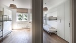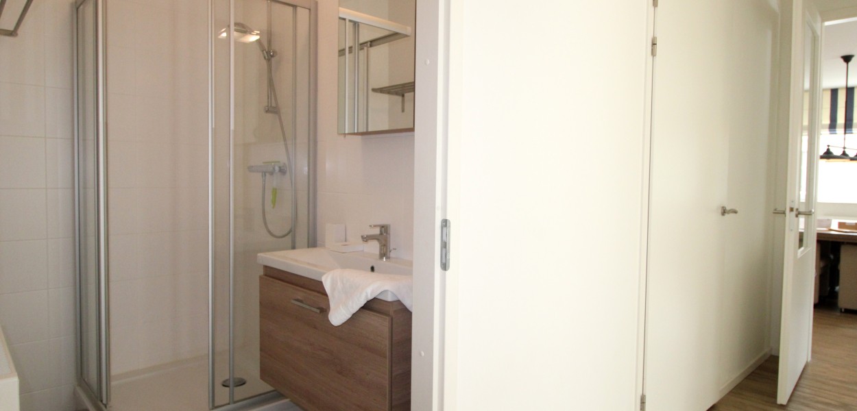 De drie slaapkamers zijn praktisch en compleet ingericht. In de masterbedroom slaapt u op een luxe boxspringcombinatie en in de tweede en derde slaapkamer zijn middels een slimme wandconstructie 2 eenpersoonsbedden boven elkaar geplaatst. Om ruimte te besparen kunt u deze ook met 1 beweging dichtklappen en heeft u extra vloeroppervlak in de slaapkamer of juist een enkel eenpersoonsbed. Bij dit appartement staat standaard een kinderbedje tot uw beschikking, uniek met een opzetstuk om uw kleintje te verschonen en een bodemverhoger voor de allerkleinsten. Alle slaapkamers zijn voorzien van voldoende kastruimte. Er zijn 2 badkamers, waarvan de grootste is ingericht met een douche, een dubbele wastafel en een toilet. De tweede badkamer is voorzien van een douche en een wastafel. Het aparte gastentoilet bevindt zich in de hal evenals een praktische berging met daarin een wasmachine en droger.