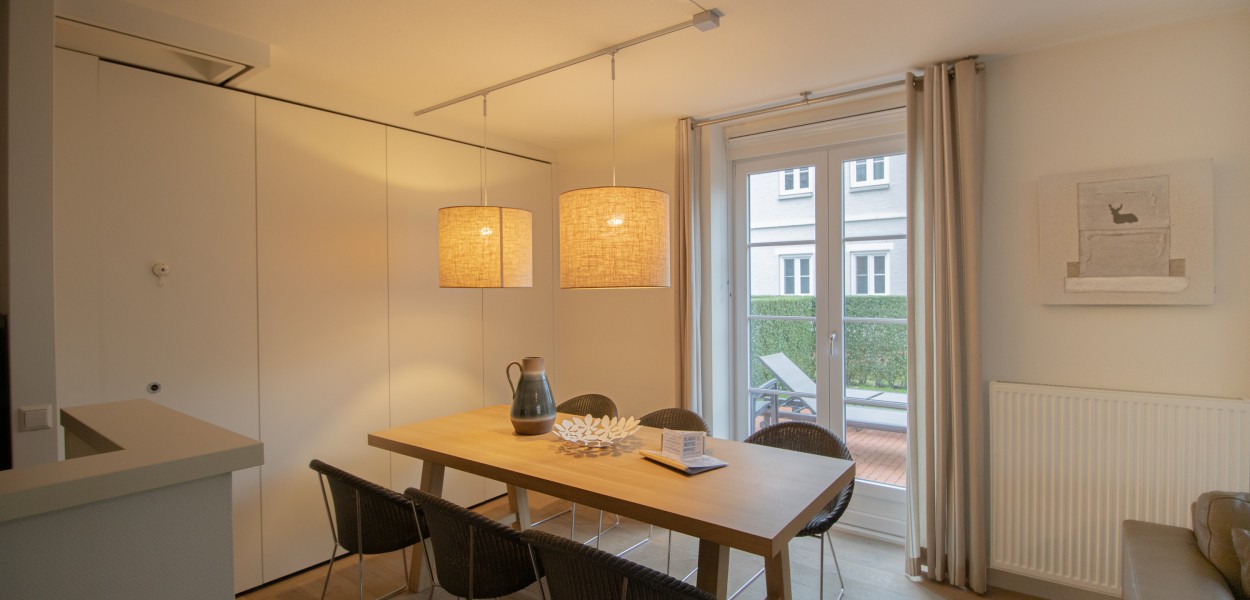 De compleet ingerichte open keuken en ruime eettafel maken het aantrekkelijk om ook eens thuis te koken. De keuken is voorzien van een combimagnetron, koel-vriescombinatie, afwasmachine, Senseo apparaat en een Nespresso machine. Vanuit de woonkamer kunt u via de openslaande deuren direct de tuin in wandelen. Nog een extra aan deze woning is dat u deze woning kunt samen voegen met appartement I - 03 welke hiernaast gelegen is, deze middels een schuifsysteem die open kan. Dit appartement met sauna en heerlijke tuin biedt de ideale uitvalsbasis voor een verblijf in Cadzand-Bad.