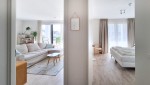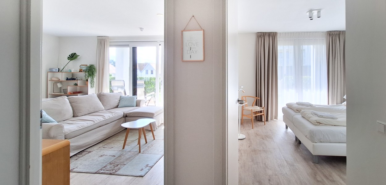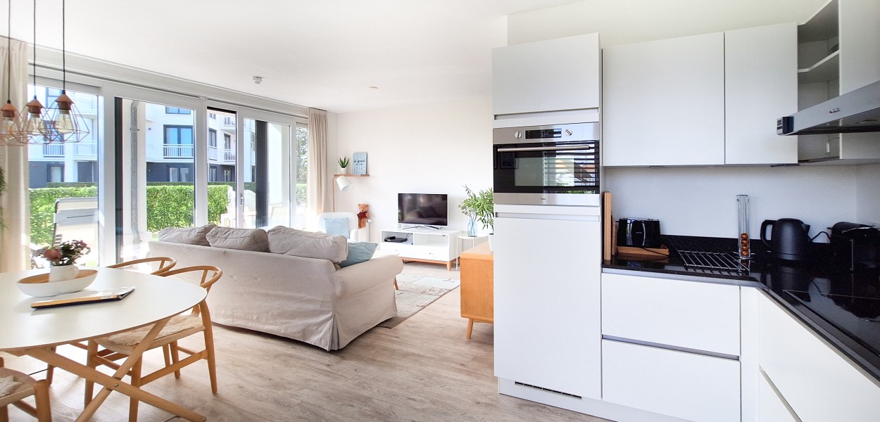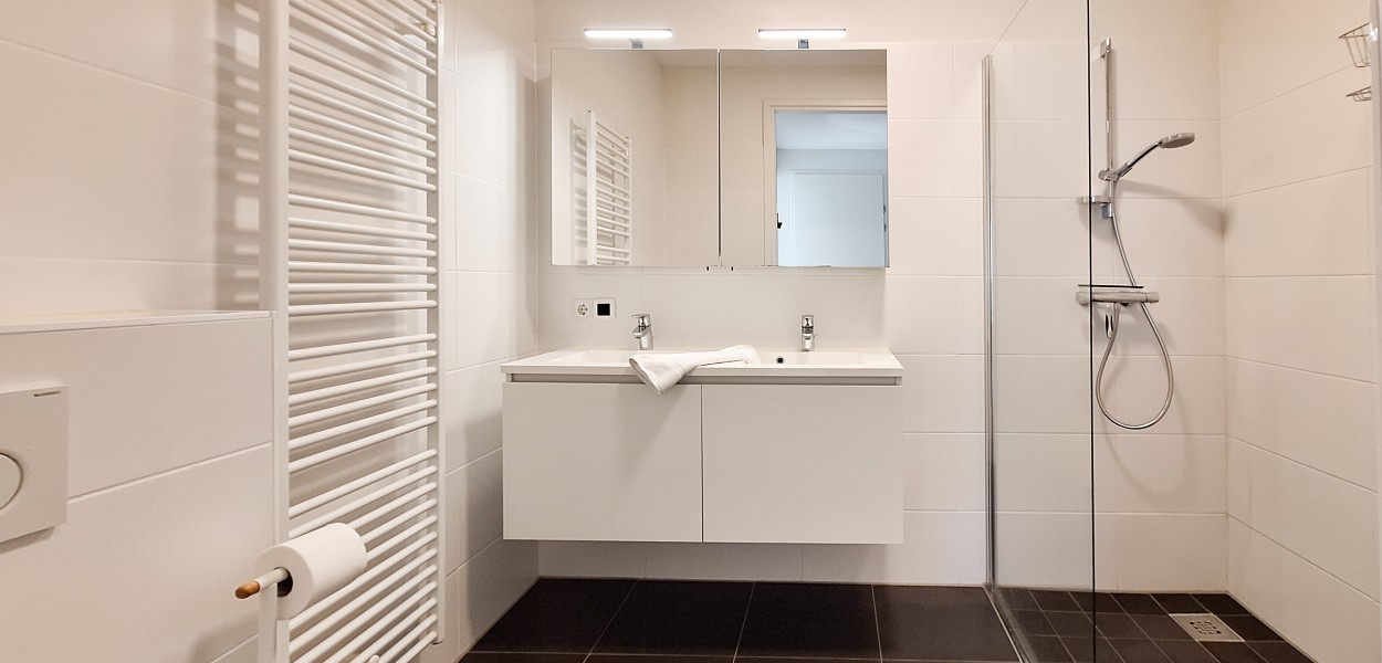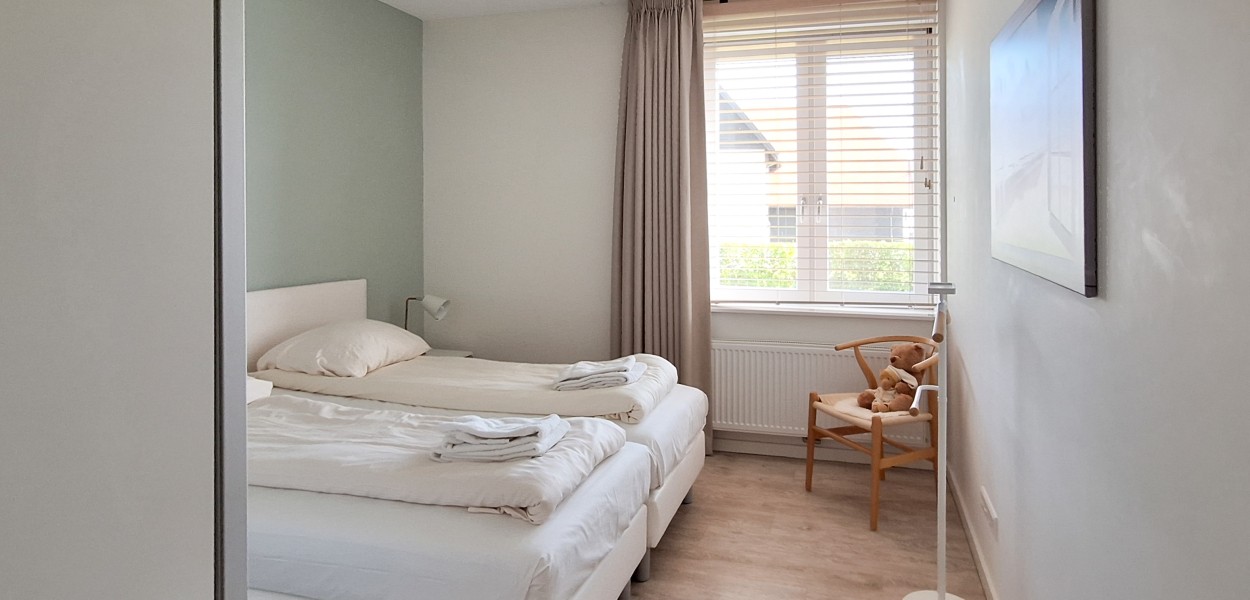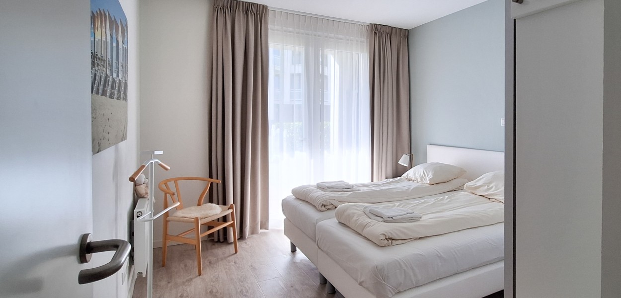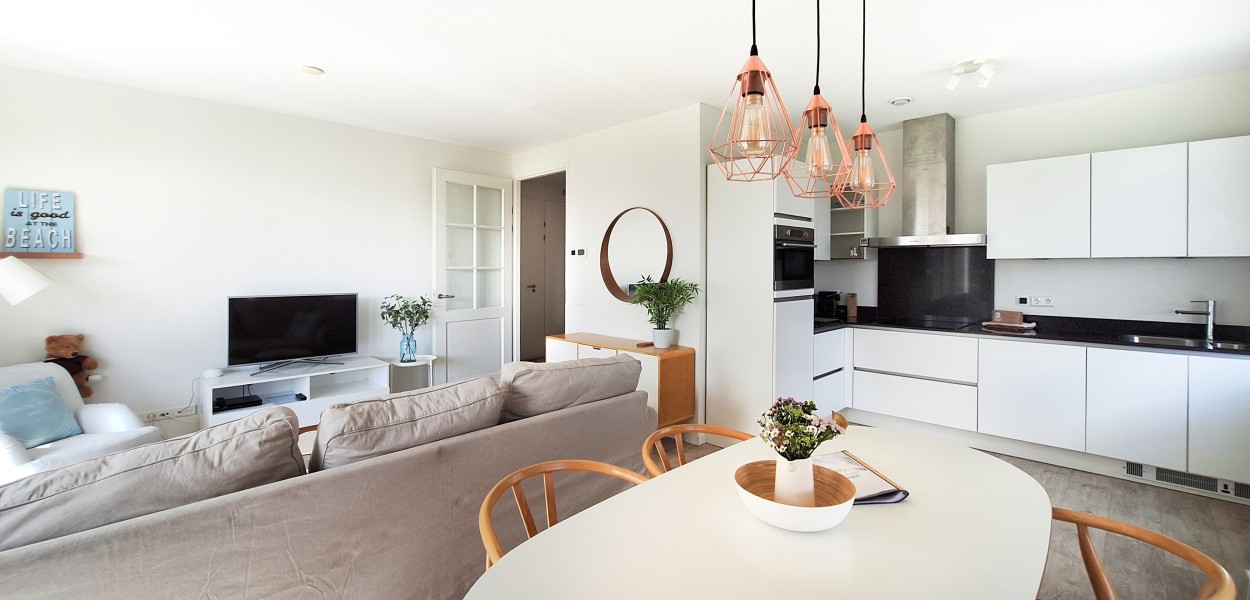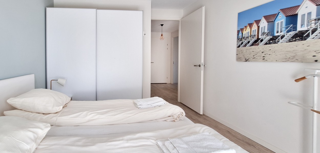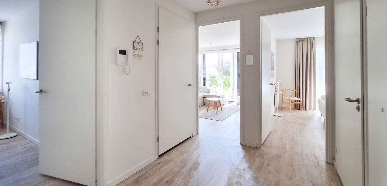 In de woonkamer is een prettige zithoek met, behalve een televisie, ook een Blu-ray-speler tot uw beschikking. In dit woongedeelte bevindt zich ook een stijlvolle eettafel, grenzend aan de keuken. De open keuken is voorzien van alle gemakken en heeft naast een Nespresso-apparaat, ook een inductiefornuis, een combimagnetron, een koelkast met een vriesvak en een vaatwasmachine. De slaapkamers zijn comfortabel en compleet ingericht. U slaapt op luxe boxspringcombinaties en heeft in elke slaapkamer een ruime kledingkast. De badkamers zijn beide voorzien van een inloopdouche, wastafel en een toilet. Een praktische berging met daarin de wasmachine en droger vindt u in de hal van het appartement.