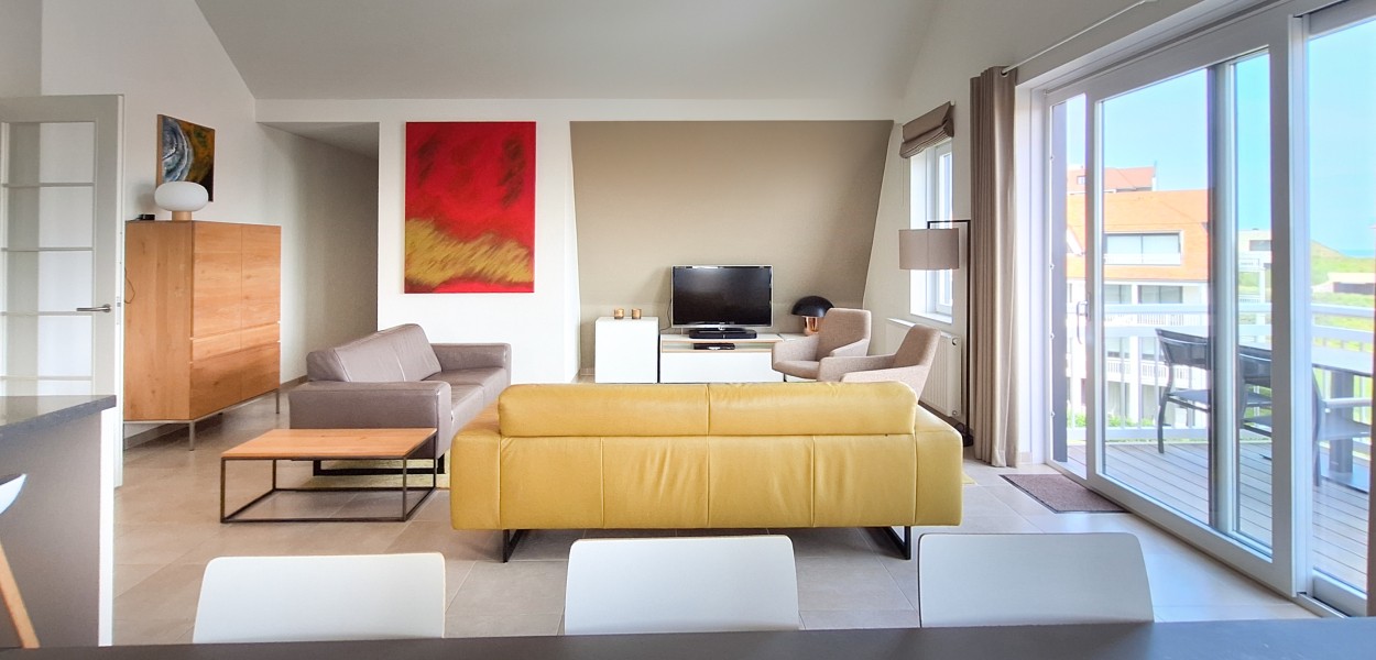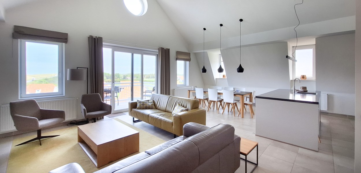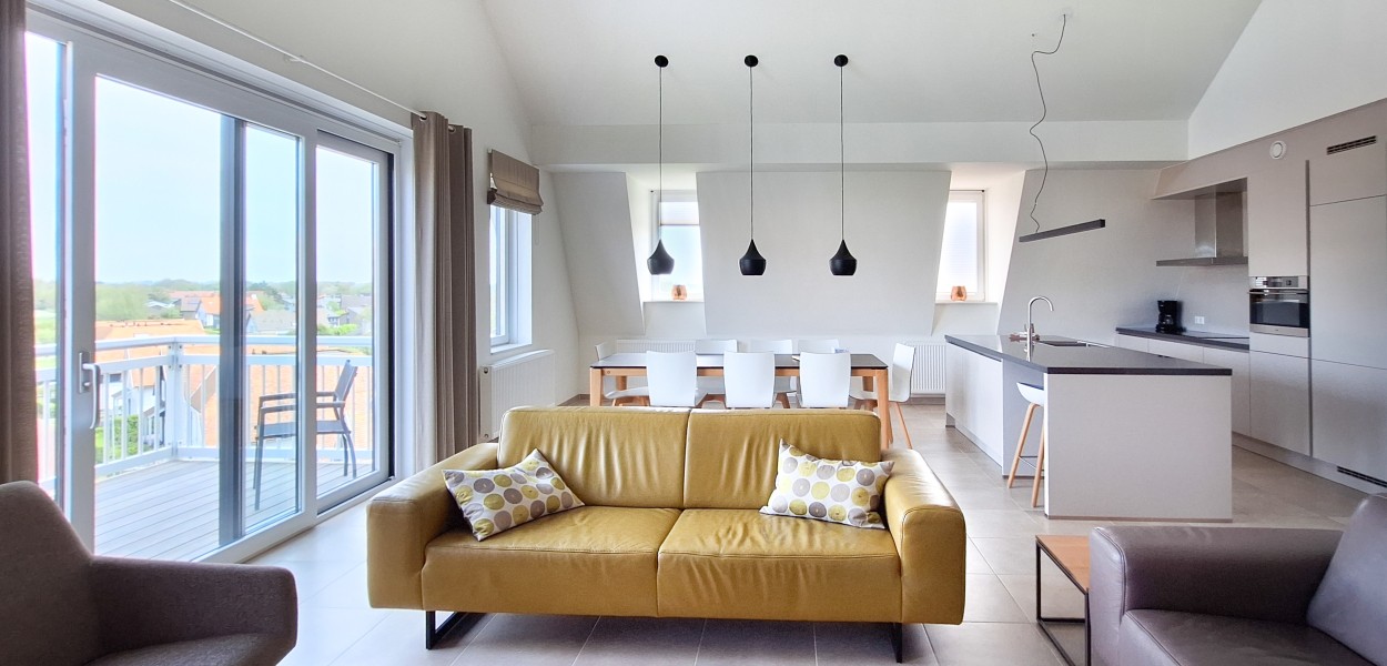 De woonkamer heeft een gezellige zithoek met digitale televisie en een Blu-ray-speler en grenst aan het ruime eetgedeelte met grote eettafel. U kunt hier genieten van breedbeeldgeluid en muziekstreaming door middel van de Sonos playbase die tot uw beschikking staat. De open keuken beschikt over een spoeleiland met 2 barkrukken, een afwasmachine, een inductiekookplaat, een combimagnetron, een koelkast en een vriezer met 3 ruime lades, filterkoffiezetapparaat en een Nespresso-apparaat.