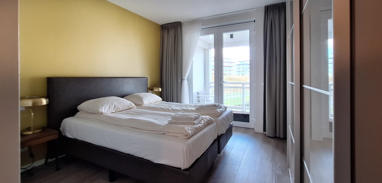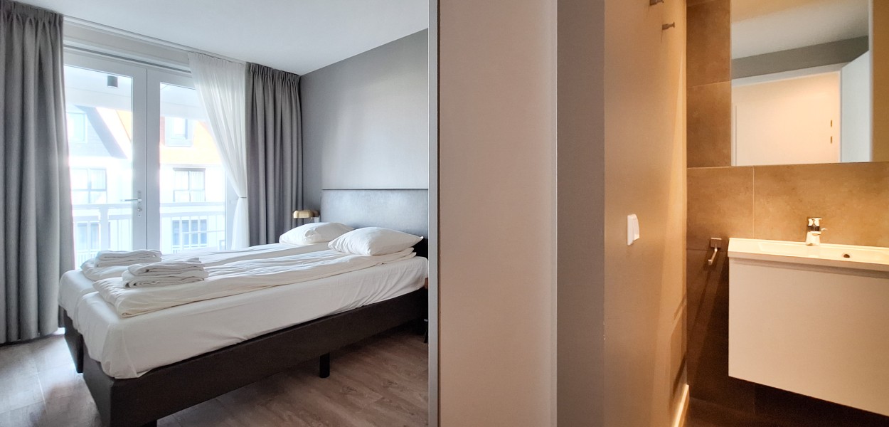 In de luxe afgewerkte open keuken is aan alles gedacht, deze is voorzien van een Nespresso-apparaat, inductiekookplaat, combimagnetron, koelkast, diepvries en een afwasmachine. De gezellige bar met barkrukken verbindt de keuken met de sfeervolle woonkamer. Deze omvat een prettige zithoek met televisie, en een soundbar voor optimaal geluid. Er staat ook een Blu-ray speler tot uw beschikking. De beide slaapkamers zijn sfeervol en compleet ingericht met comfortabele boxspringcombinaties en televisie. De twee badkamers zijn elk verschillend ingericht: één badkamer beschikt over een inloopdouche en dubbele wastafel met toilet, de tweede badkamer is ingericht met een inloopdouche en enkele wastafel. In beide badkamers is een föhn aanwezig. Een apart toilet bevindt zich in de hal evenals een praktische berging met onder andere een wasmachine en een droger. Ook aan de kleinsten is gedacht doordat er standaard een kinderstoel en kinderservies aanwezig is in dit appartement.