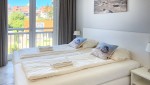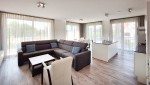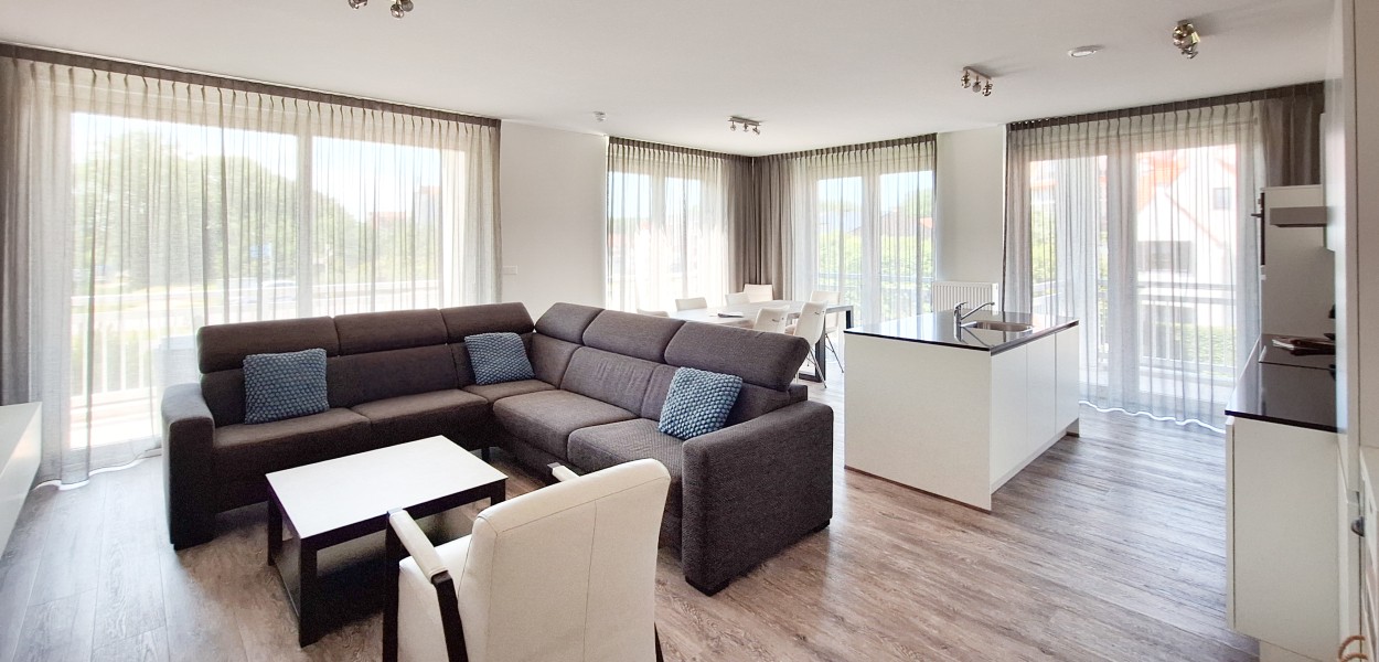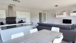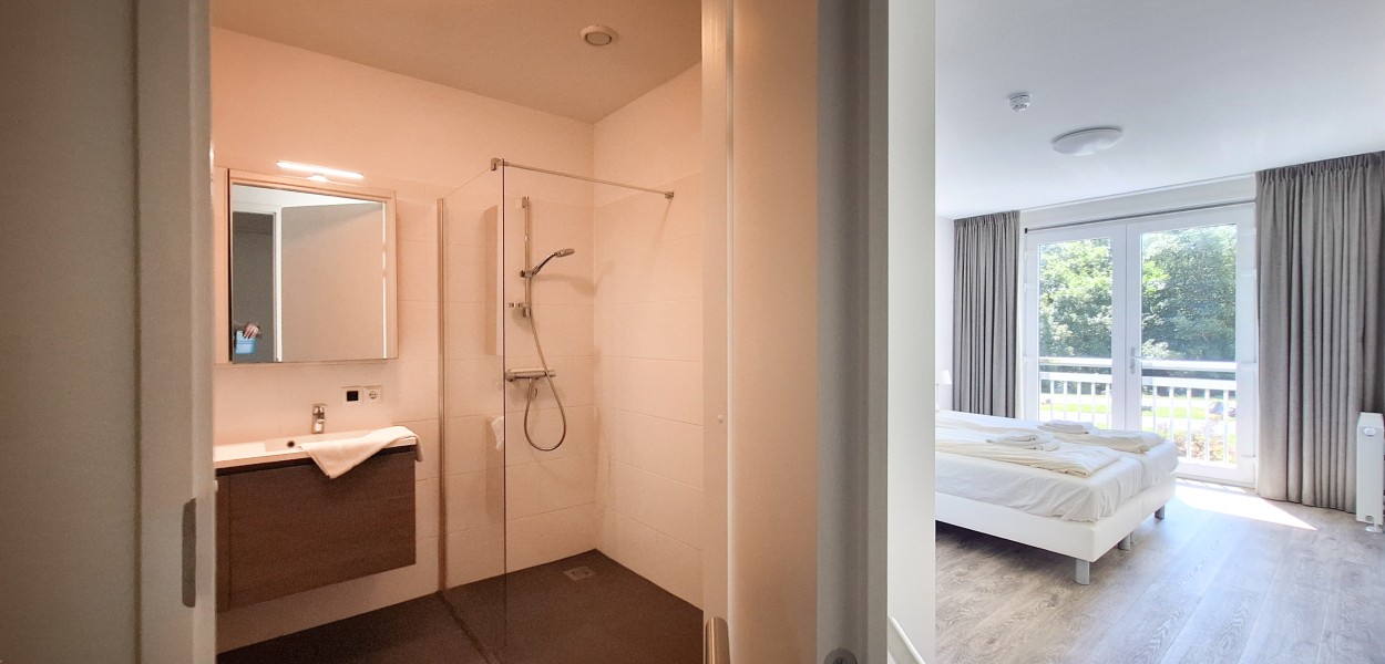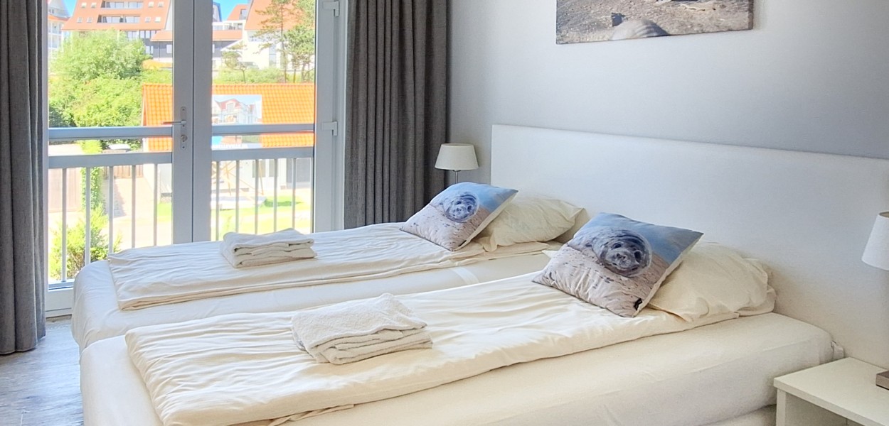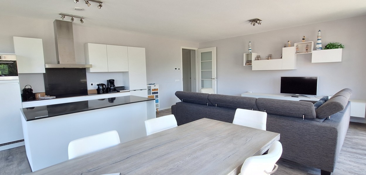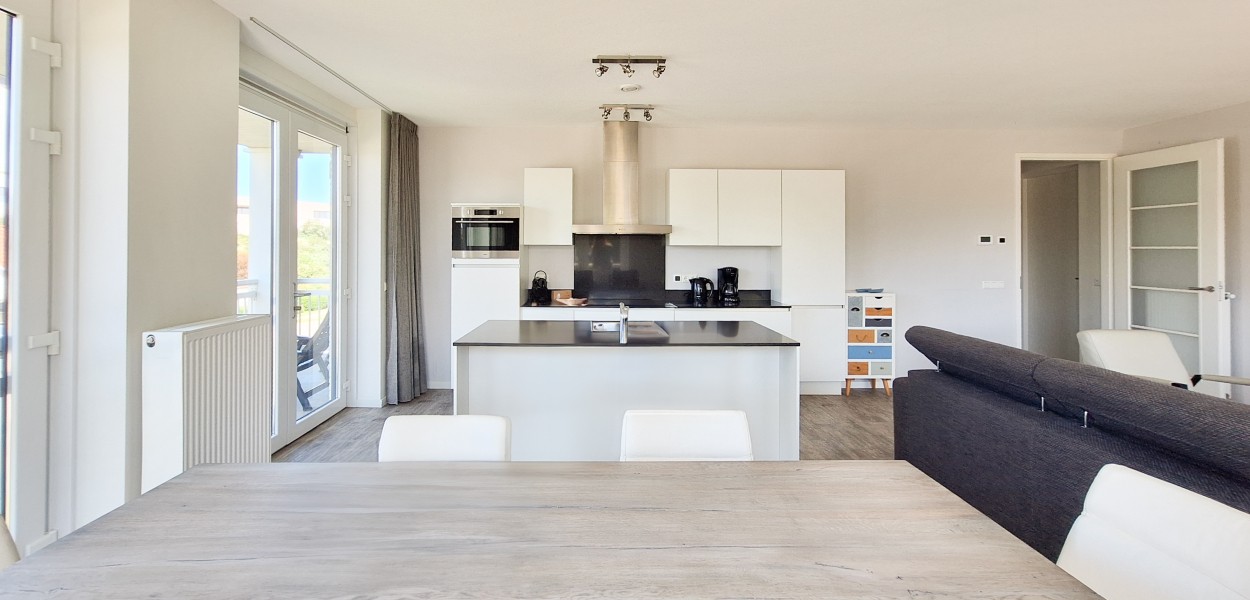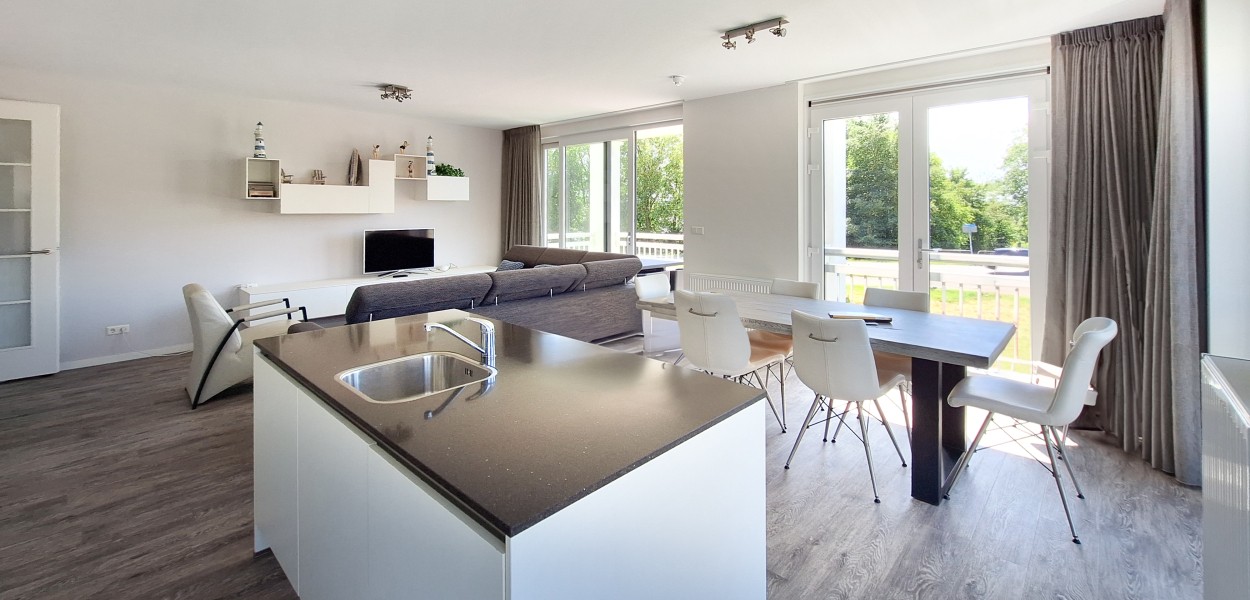 Vanaf de woonkamer heeft u toegang tot beide balkons waarvandaan u vrij zicht richting het dorp en de duinen heeft; door hun ligging bieden ze zon van de middag tot de avond en geniet u van de mooiste zonsondergangen. De woonkamer zelf omvat een zithoek, een gezellig eetgedeelte, barkrukken aan het eiland en een ruime open keuken, voorzien van een Nespresso-apparaat, inductiekookplaat, combimagnetron, koelkast en afwasmachine. De extra kastruimte maakt deze keuken extra luxe. Overigens heeft u behalve een televisie met uitgebreid digitaal zenderpakket ook een dvd-speler tot uw beschikking.