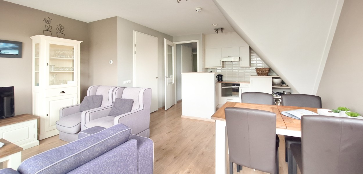 De woonkamer bestaat uit een comfortabele zithoek en een sfeervolle open keuken met eetgedeelte. De keuken is voorzien van een Senseo-apparaat, combimagnetron, koel-vriescombinatie, een afwasmachine en een uitgebreide inventaris. Als u voor dit appartement kiest dan bent u verzekerd van een fijn verblijf in Cadzand.