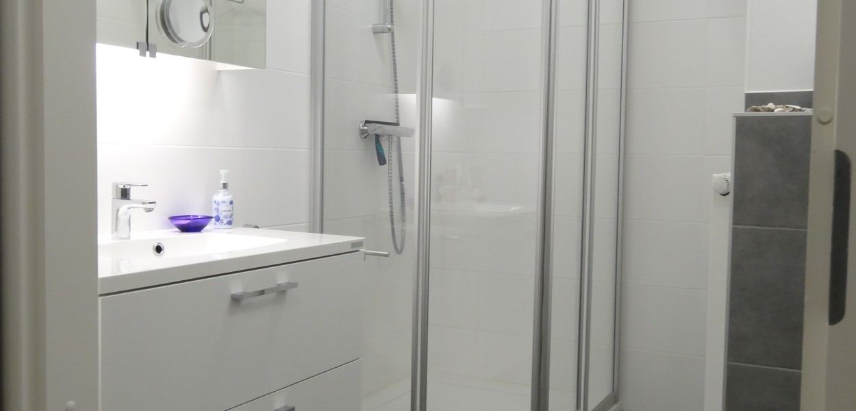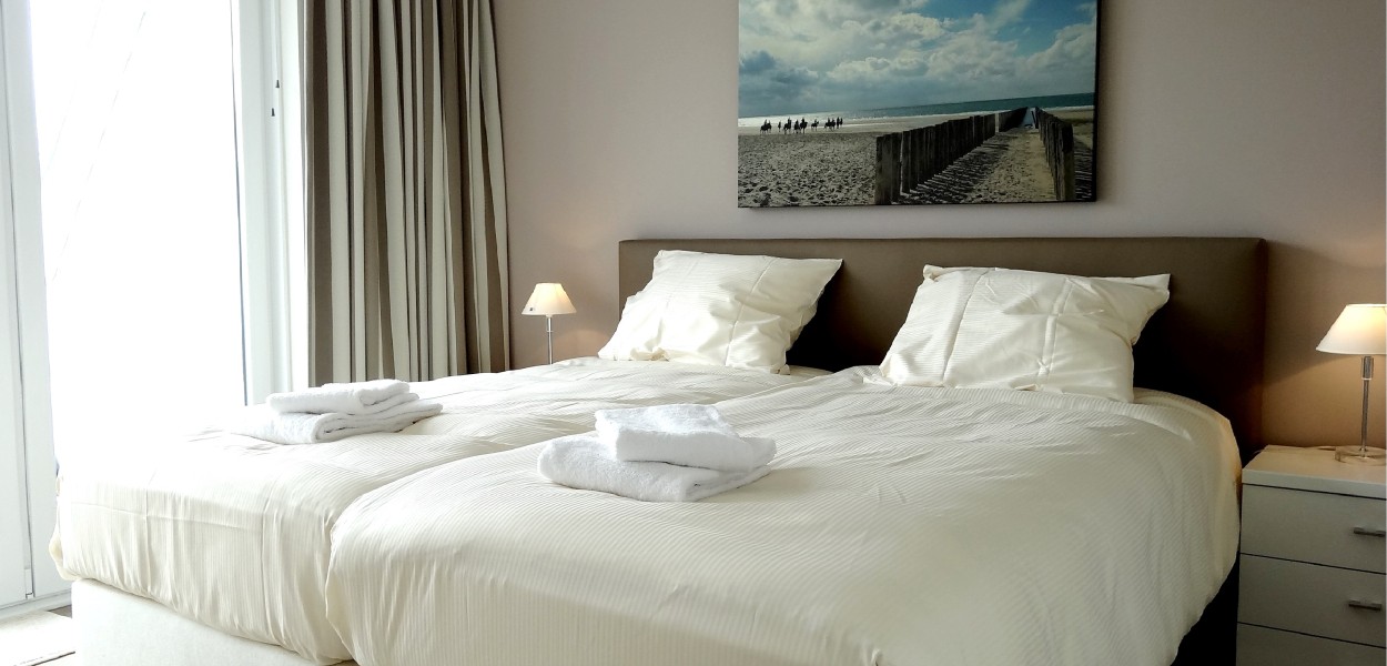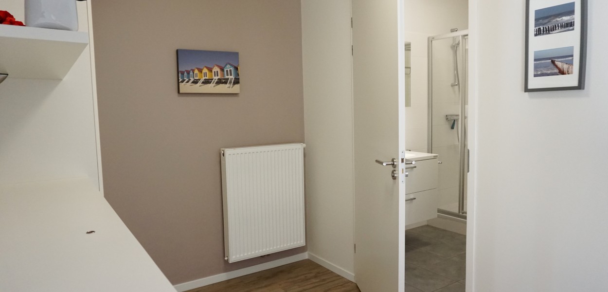 De luxe en lichte slaapkamer is zeer volledig ingericht. De openslaande deuren naar het balkon en de luxe boxspring combinatie zorgen voor extra comfort. Tevens zijn er een grote kledingkast en kofferrek aanwezig. De ruime badkamer is uitgerust met een douche, een wastafel en een toilet. Een praktische berging met een wasmachine vindt u in de hal.