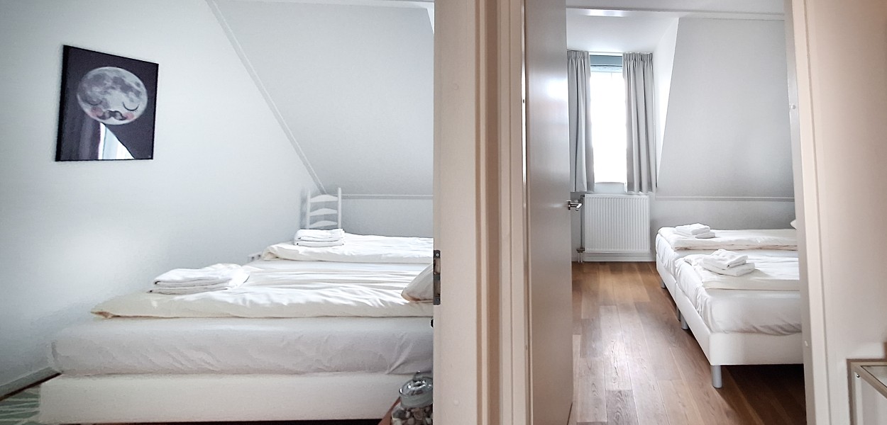 De slaapkamers van dit appartement zijn fris en origineel ingericht. In beide kamers slaapt u in luxe boxspringcombinaties. De badkamer is voorzien van een ruime inloopdouche en een wastafel. Op de gang bevindt zich een separaat toilet. Tevens beschikt u over een handige berging met wasmachine en droger.