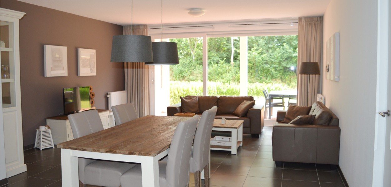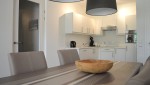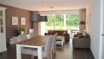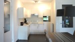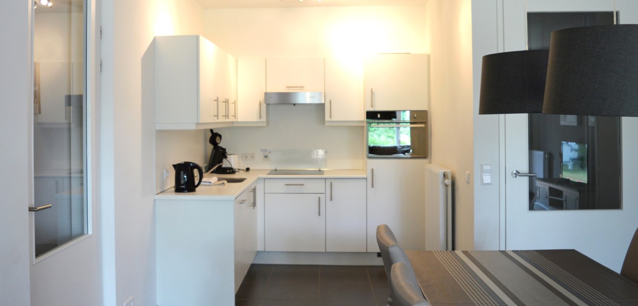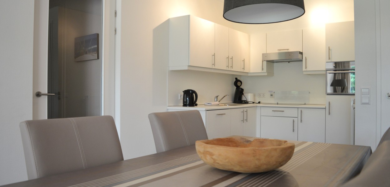 De sfeervolle open keuken is voorzien van een combimagnetron, koel-vriescombinatie, afwasmachine en uitgebreide inventaris met een Senseo-apparaat en wordt door de grote eettafel verbonden met de woonkamer. De combinatie van de lichte woonkamer, ruime open keuken en openslaande deuren naar de zonnige tuin, geeft veel wooncomfort aan dit appartement.