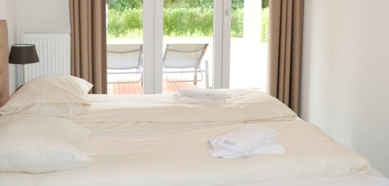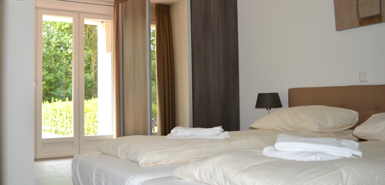 Beide slaapkamers van de woning zijn elegant en sfeervol ingericht en hebben openslaande tuindeuren naar het terras. U slaapt op luxe boxspringcombinaties. Eén badkamer vindt u grenzend aan de masterbedroom, deze is bijzonder royaal en praktisch ingericht met een douche, dubbele wastafel en toilet. De andere badkamer is eveneens erg ruim en is ingericht met een douche en een enkele wastafel. In de tweede badkamer vindt u tevens een föhn. Het appartement beschikt verder over een praktische berging waar u ook een wasmachine en droger aantreft.