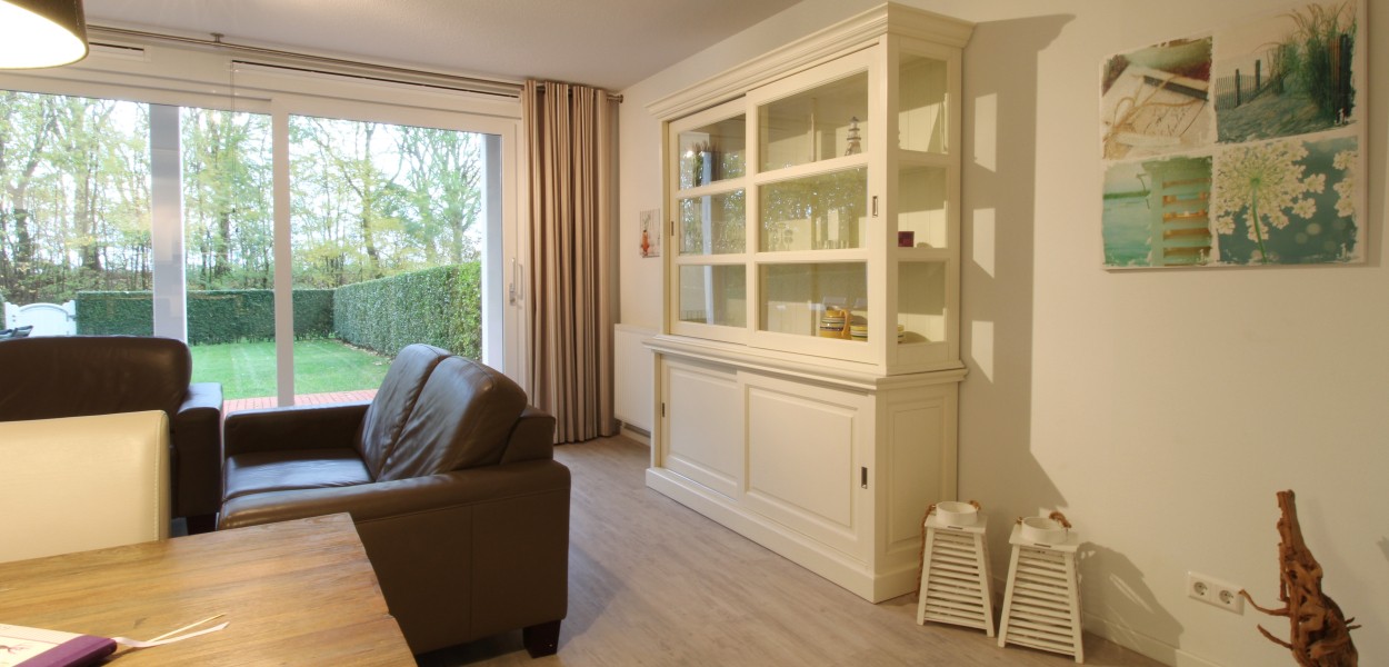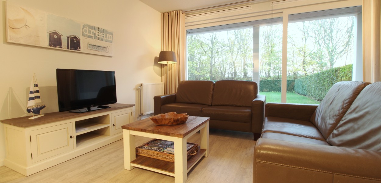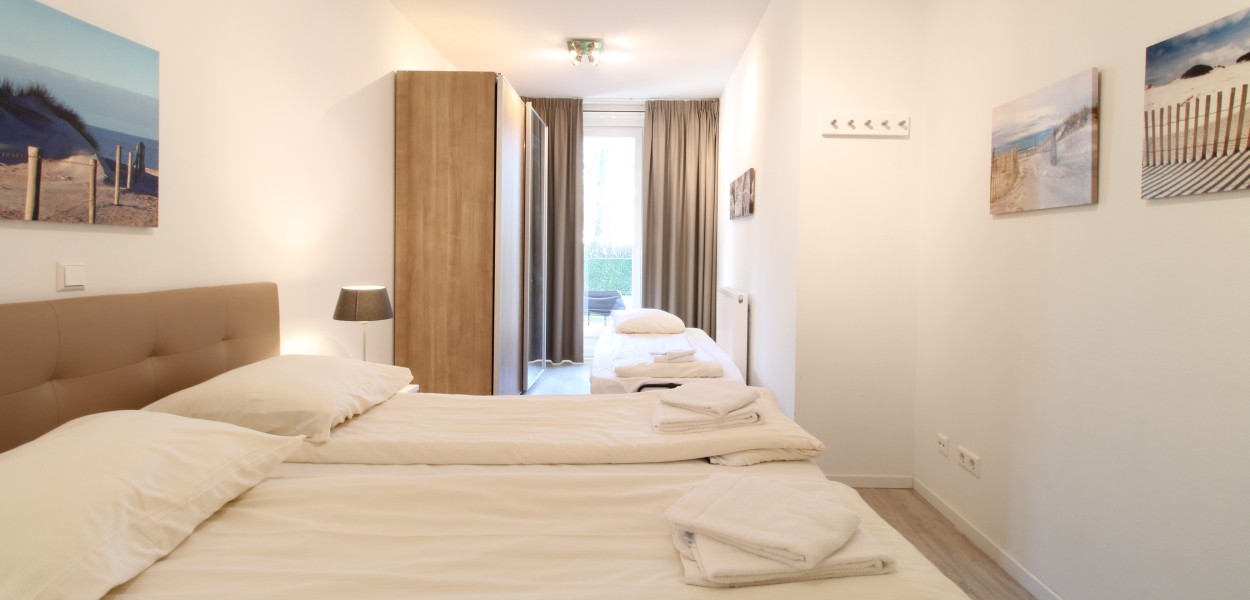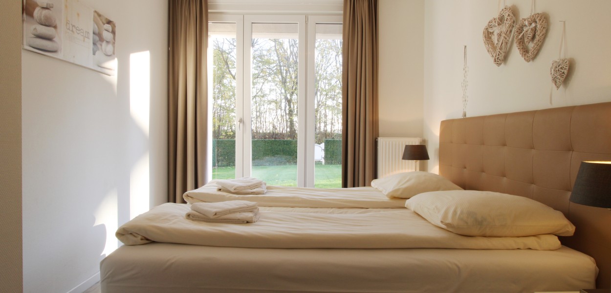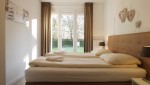 Een ruim en stijlvol gelijkvloers appartement van 96m². Zowel de woonkamer als beide slaapkamers hebben openslaande deuren die toegang geven tot de rustige, op het zuiden gelegen tuin met terras. Doordat er een extra bed aanwezig is, is het mogelijk om hier met vijf personen te verblijven.