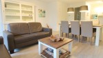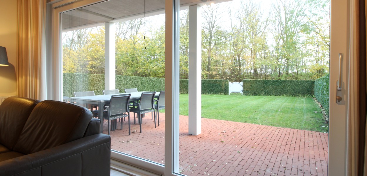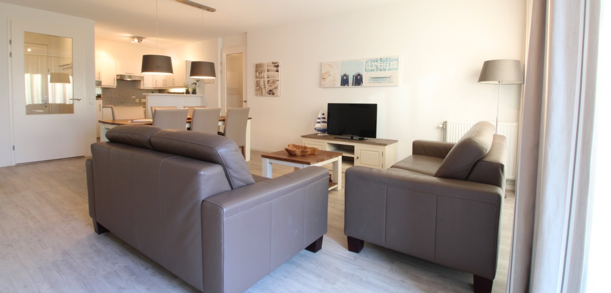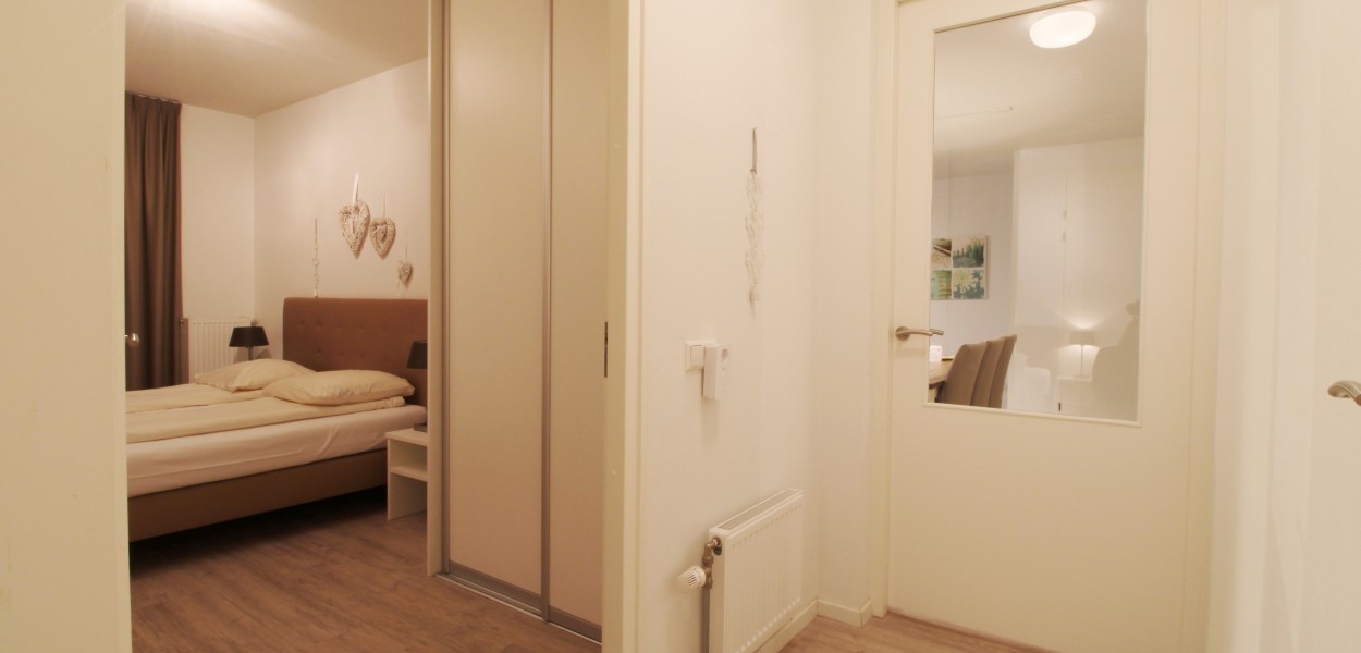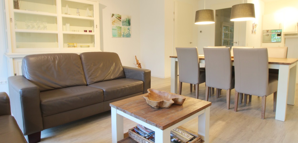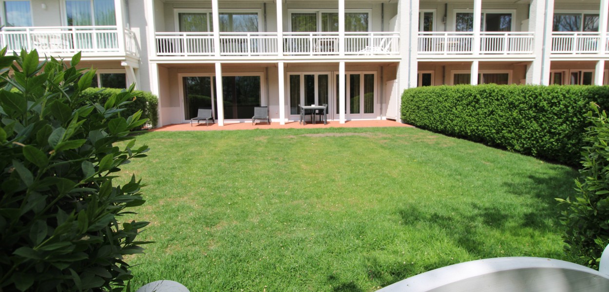 Een ruim en stijlvol gelijkvloers appartement van 96m². Zowel de woonkamer als beide slaapkamers hebben openslaande deuren die toegang geven tot de rustige, op het zuiden gelegen tuin met terras. Doordat er een extra bed aanwezig is, is het mogelijk om hier met vijf personen te verblijven.
