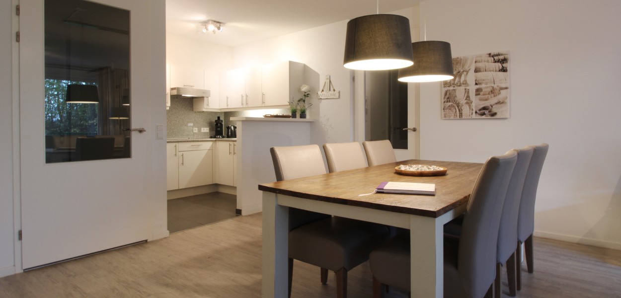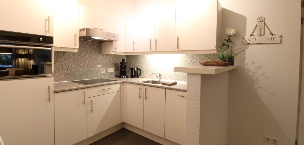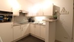 De open keuken is voorzien van een Senseo-apparaat, combimagnetron, koel-vriescombinatie, afwasmachine en uitgebreide inventaris. De combinatie van de lichte woonkamer, de open keuken en openslaande deuren naar de royale en zonnige tuin geeft veel wooncomfort aan het appartement.