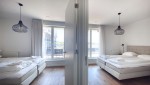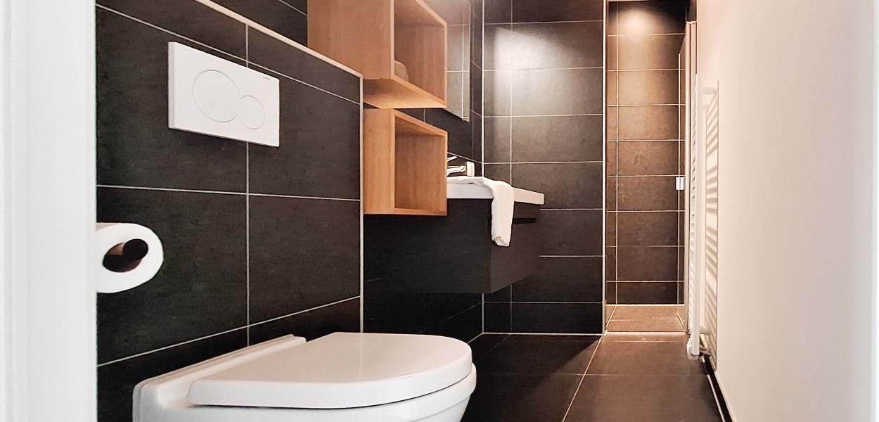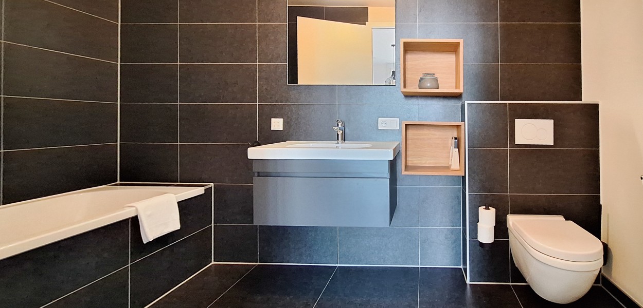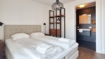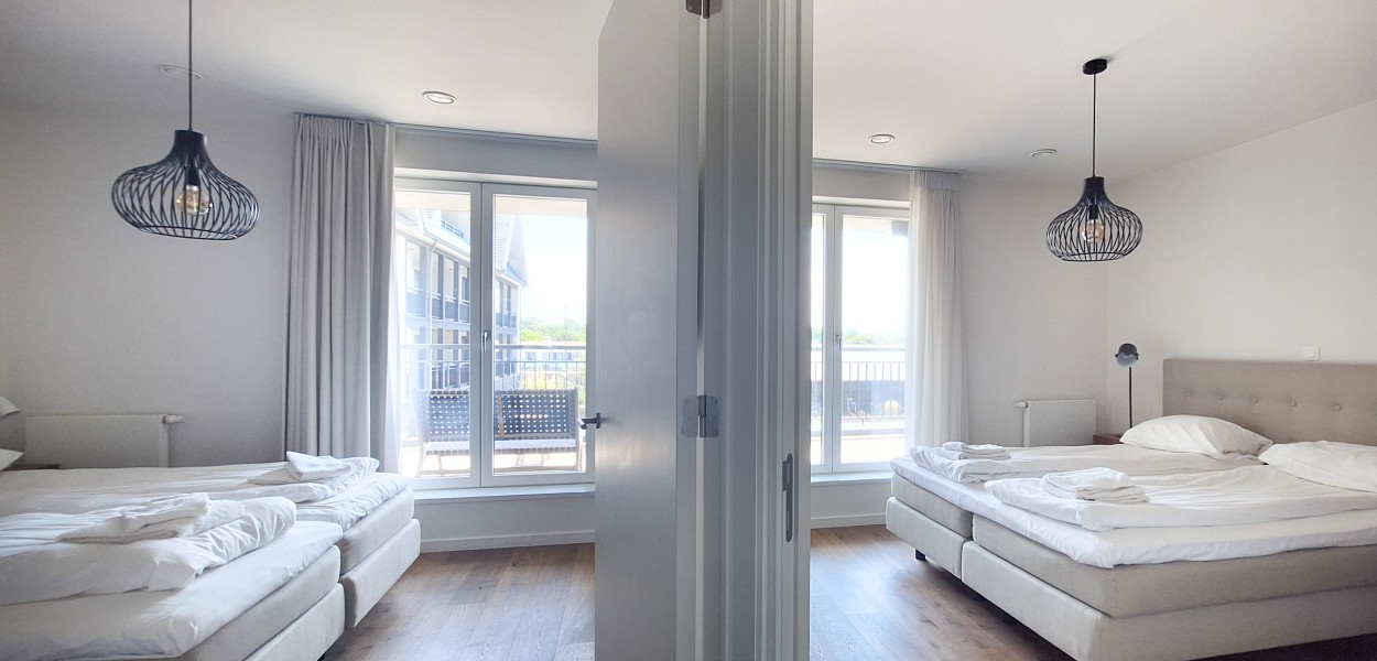 Beide slaapkamers zijn voorzien van boxspringcombinaties en een televisie en geven toegang op het zuidelijk gelegen balkon waar 2 relax fauteuils zijn voorzien. Er zijn 2 badkamers, één badkamer en suite en één badkamer toegankelijk vanuit de hal, De badkamer ensuite is uitgerust met een ligbad en een dubbele wastafel. De tweede badkamer heeft een inloopdouche, toilet en een wastafel. Een apart toilet is in de hal evenals een praktische berging met daarin de wasmachine en wasdroger.