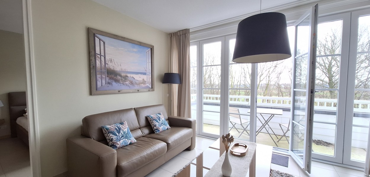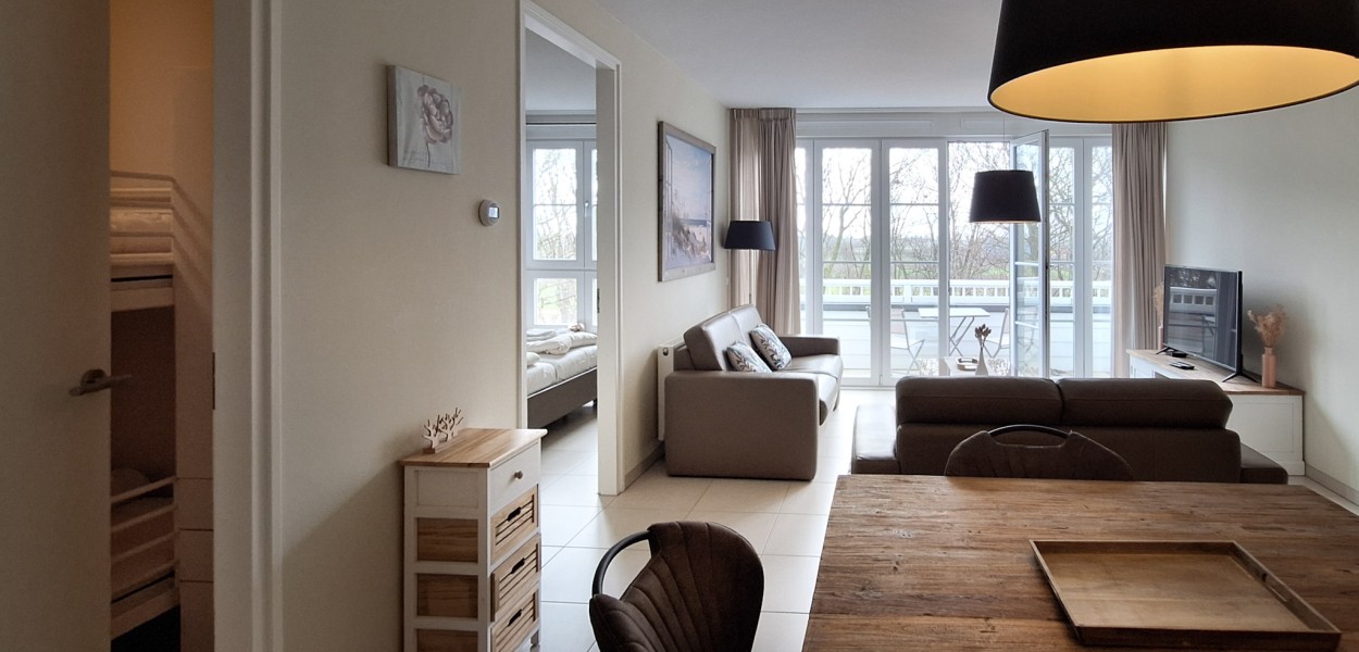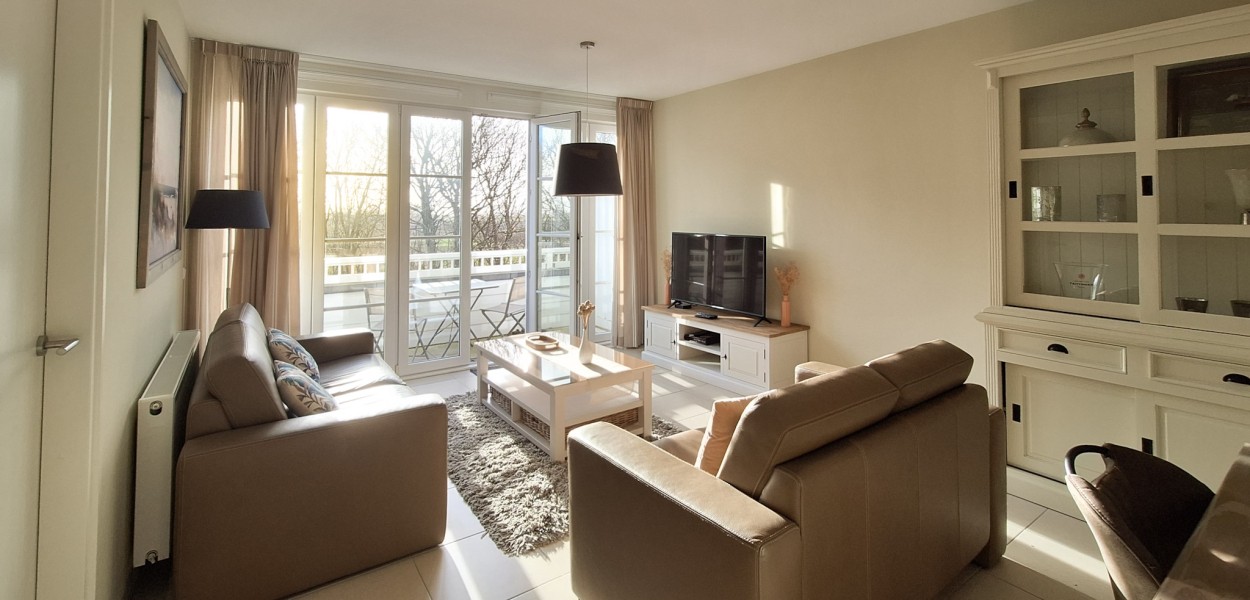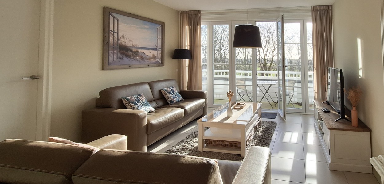 De combinatie van de lichte, gezellige woonkamer met de open keuken en de grote terrasdeuren naar het balkon die voor veel lichtinval zorgen, maken van dit appartement een erg aangename uitvalsbasis voor een vakantie aan de Zeeuwse kust.