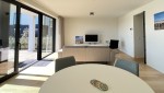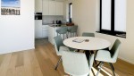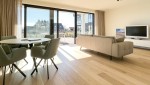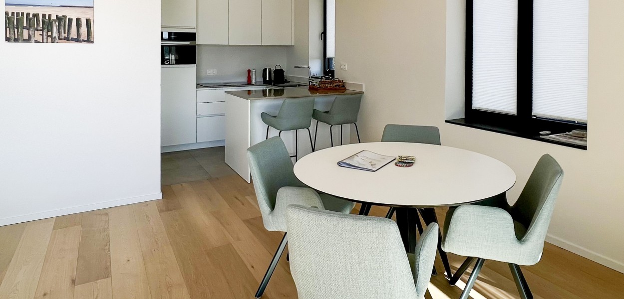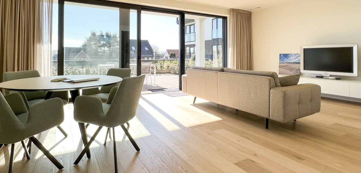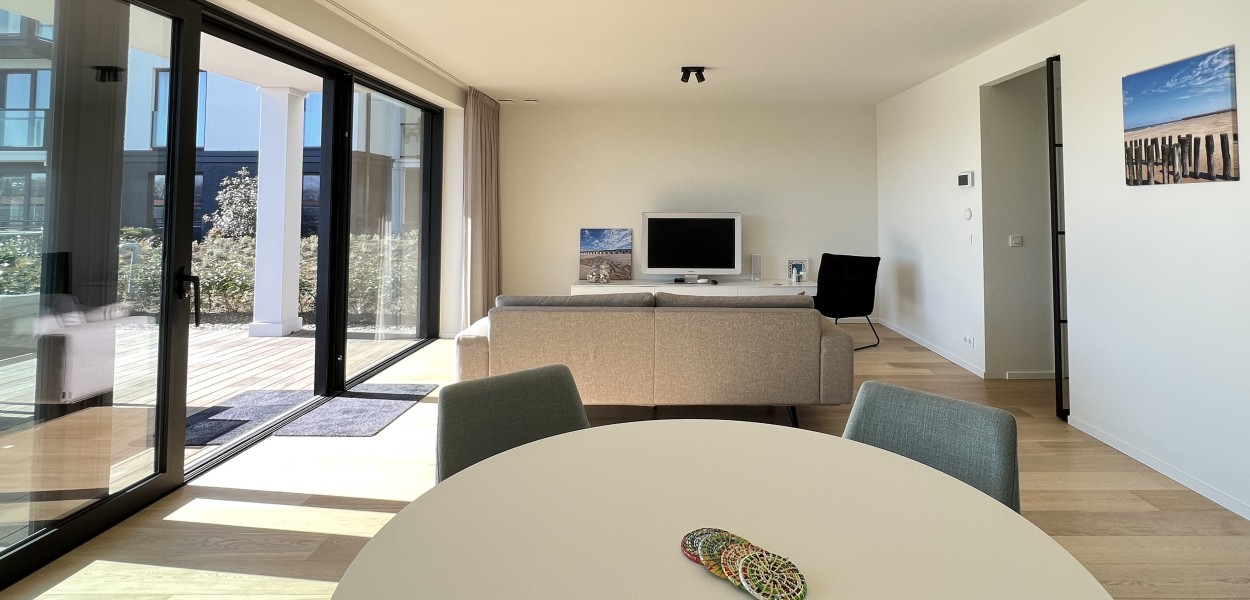 De woonkamer is voorzien van een comfortabel zitgedeelte met televisie met chromecast en een schuifpui die opent naar het terras op het zuiden. Er is een eetgedeelte met een ronde tafel met 4 stoelen die de open ruimte met de keuken verbindt. De keuken heeft een gezellige eetbar met 2 zitkrukken en is voorzien van een Nespresso-machine, inductiekookplaat, combimagnetron, koelkast met vriesvak en een afwasmachine.