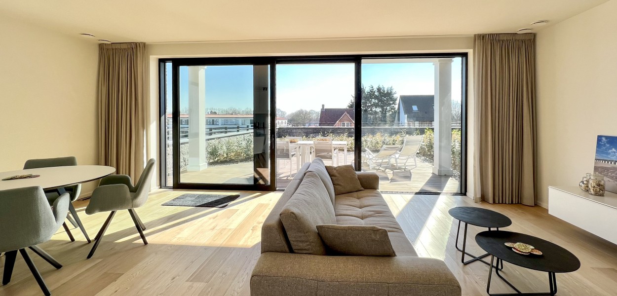 Een heerlijk licht hoekappartement van 84m² op de eerste etage/ begane grond in het nieuwere complex de Branding. Met 2 slaapkamers en een ruime badkamer biedt dit appartement u alles wat u nodig heeft voor een heerlijk verblijf in het centrum van Cadzand. Uniek aan deze woning is de ligging op het zuiden met een terras in de gedeelde duintuin - u geniet hier de hele dag van de zon. Vanaf het terras kijkt u uit over het Duinplein waar altijd wel iets gebeurt. Het appartement ligt direct in de duinen vlakbij het strand, de jachthaven, winkels en restaurants. Direct naast het appartement bevindt zich het Strandhotel met ontbijtrestaurant Pine House.