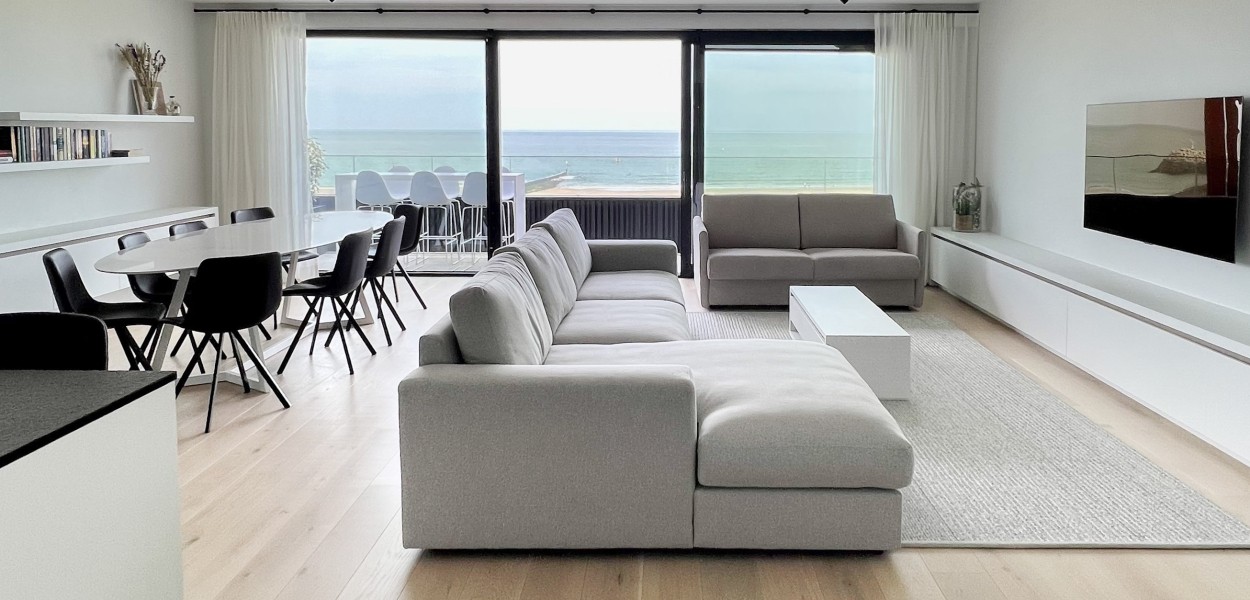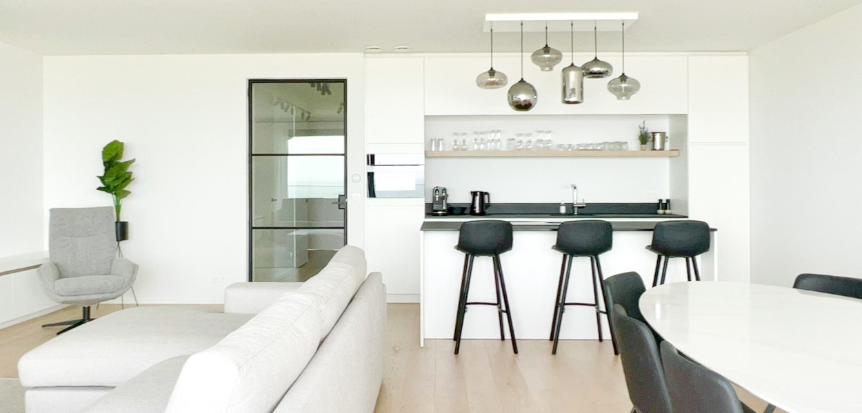 Het leefgedeelte bestaat uit een ruime, zeer eigentijds ingerichte woonkamer, praktische keuken en een eetgedeelte vanwaar u een fantastisch uitzicht geniet over duinen en zee. De woonkamer is voorzien van een comfortabel zitgedeelte met televisie waarop een uitgebreid zenderpakket te bekijken is en een schuifpui welke opent naar het balkon. Terug binnen treft u een eetgedeelte met een mooie ovale eettafel met 8 stoelen die het woongedeelte handig met de open keuken verbindt. De keuken is voorzien van een gezellig kookeiland waaraan 3 barkrukken staan, u kookt daar op inductie. Verder vindt u er een Nespresso-machine, combimagnetron, een koelkast met vriesvak en een afwasmachine. Verder staat een uiterst compleet inventarispakket tot uw beschikking.