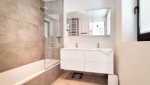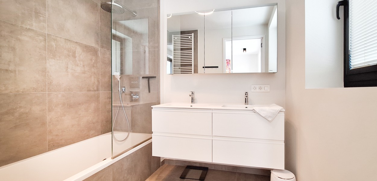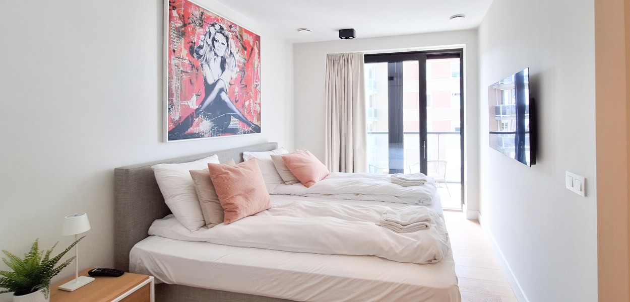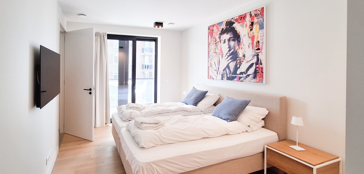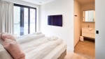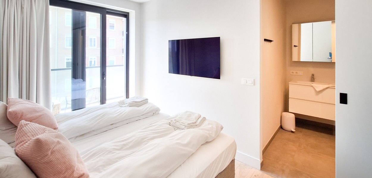 De beide slaapkamers zijn elegant ingericht met luxe boxspringcombinaties en televisie en beschikken over voldoende opbergruimte. De eerste badkamer beschikt over een ligbad en een dubbele wastafel, de tweede heeft een douche en een wastafel. Een individueel toilet bevindt zich in de hal, evenals de berging waar onder andere een was-droogcombinatie tot uw beschikking staat. De beide slaapkamers zijn voorzien van een smart-tv met uitgebreid zenderpakket.