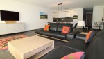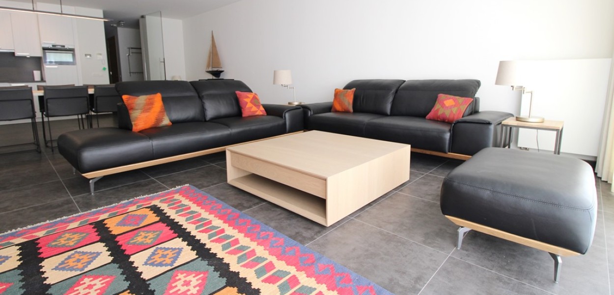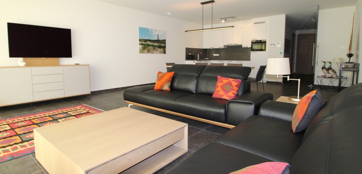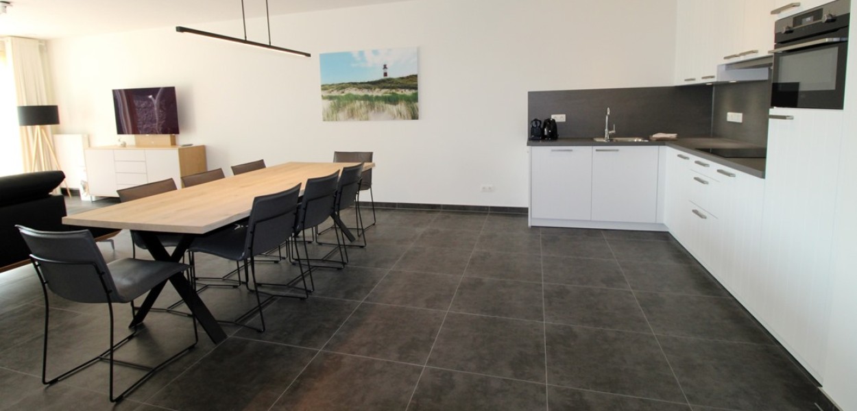 Het woongedeelte kijkt vrij uit over het binnenplein van het complex met daarachter het Duinplein en is fraai ingericht met een comfortabele zithoek met televisie waar een uitgebreid digitaal zenderpakket op is geprogrammeerd. Het eetgedeelte omvat een heerlijk grote eettafel, dus ideaal voor een gezellig etentje of een spelletje. De open keuken is voorzien van alle gemakken en heeft naast een inductiefornuis ook een combimagnetron, een koelkast met vriesvak, Nespresso-apparaat en een vaatwasmachine.