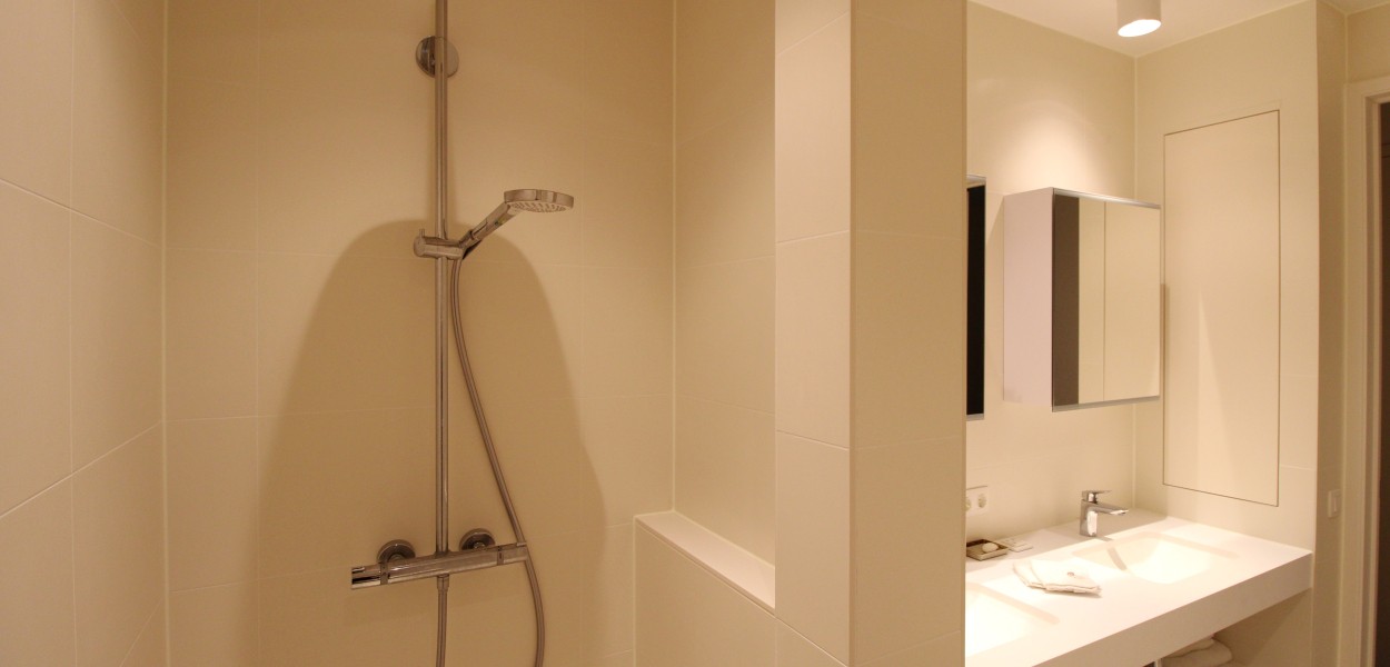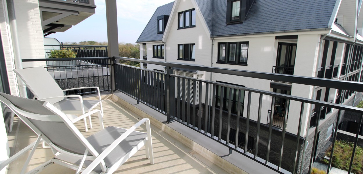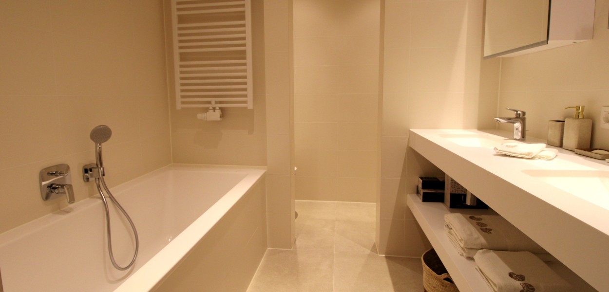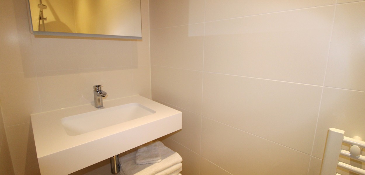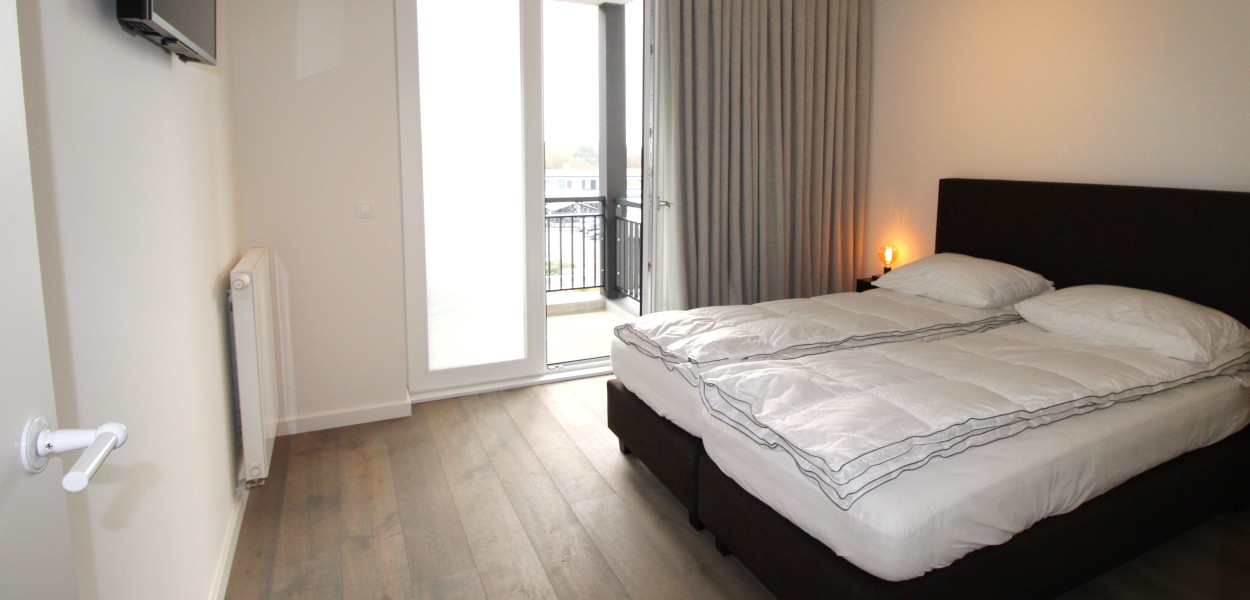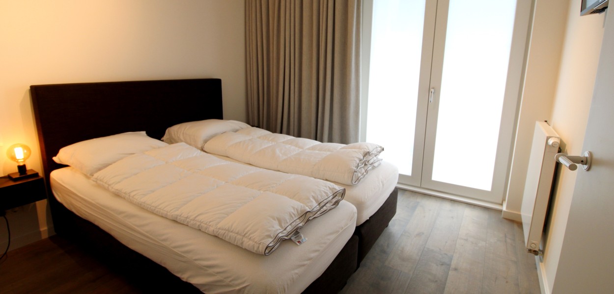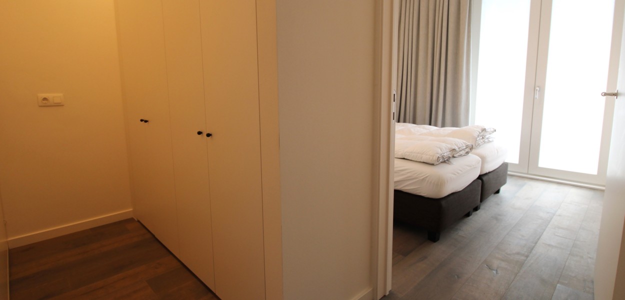 Beide slaapkamers zijn voorzien van boxspringcombinaties en een televisie en geven toegang op het zuidelijk gelegen balkon waar 2 relax fauteuils zijn voorzien. Er zijn 2 badkamers, beide toegankelijk vanuit de hal, waarvan de grootste is uitgerust met een ligbad, een inloopdouche, een dubbele wastafel en een toilet. De tweede badkamer heeft een inloopdouche en een wastafel. Een apart toilet bevindt zich overigens in de hal, evenals een praktische berging met daarin de wasmachine en wasdroger.