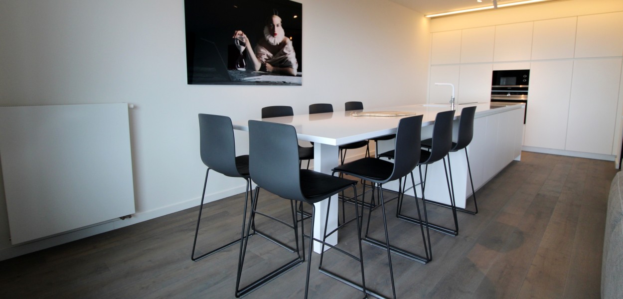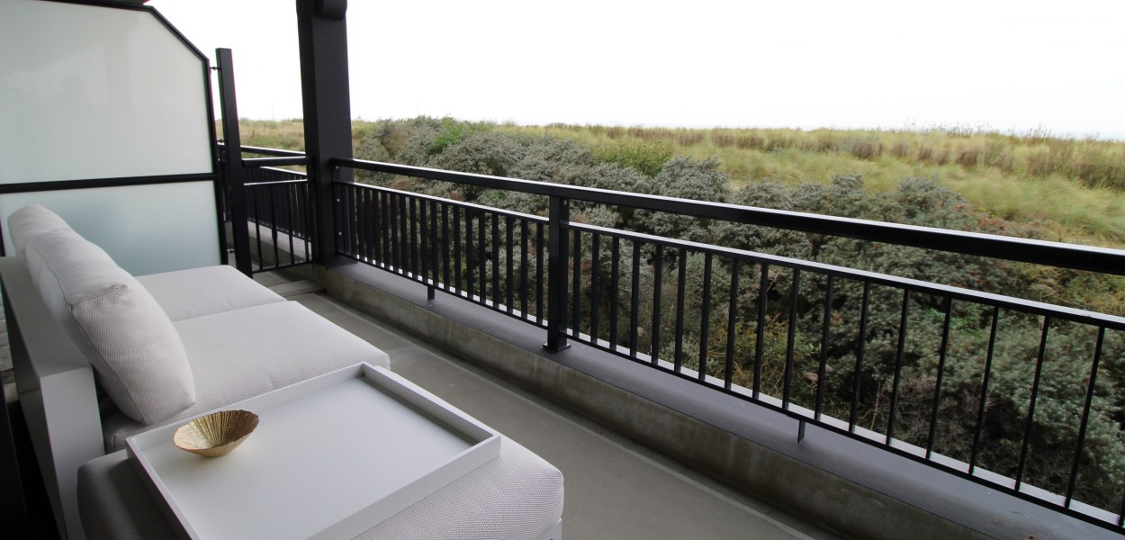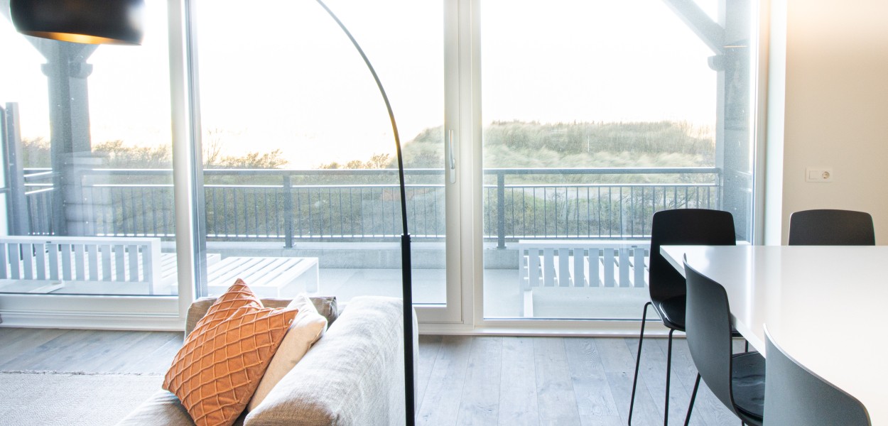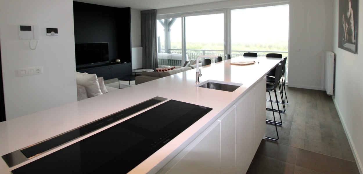 In het woongedeelte is een comfortabel zitgedeelte ingericht met meer dan voldoende zitplaatsen. Er is onder andere een televisie met uitgebreid digitaal zenderpakket. De open keuken is zeer modern en biedt behalve veel bergruimte alle benodigde apparatuur. Naast een inductiefornuis met werkbladafzuiging vindt u er ook een ingebouwde oven en magnetron, een koelkast met een vriesvak, een Nespresso-apparaat en een vaatwasmachine. In het verlengde van het aanrecht is een eetgedeelte verwerkt met 6 zitplaatsen. Dankzij de grote ramen geniet u vanuit de woonkamer én het eetgedeelte van een fantastisch uitzicht over de duinen en de Noordzee. Middels de schuifpui betreedt u het balkon dat op mooie dagen eenvoudig bij het woongedeelte kan worden betrokken dankzij een comfortabele loungeset.