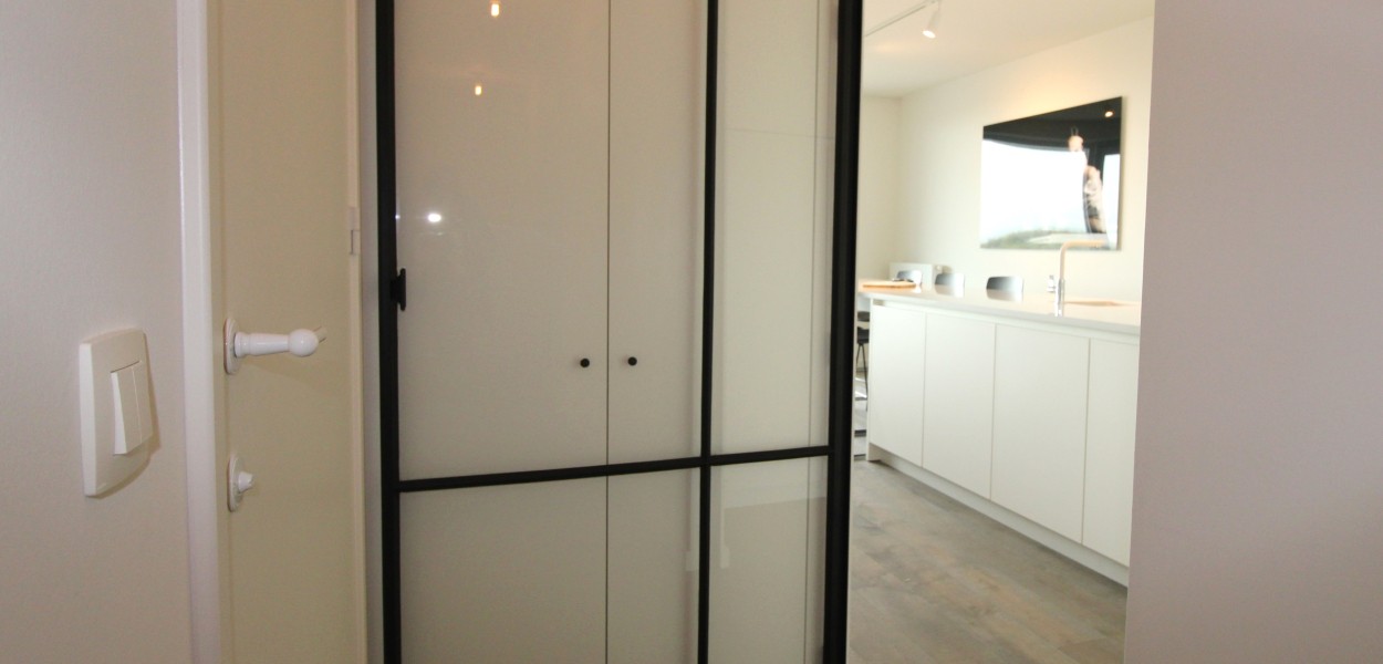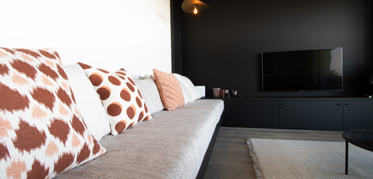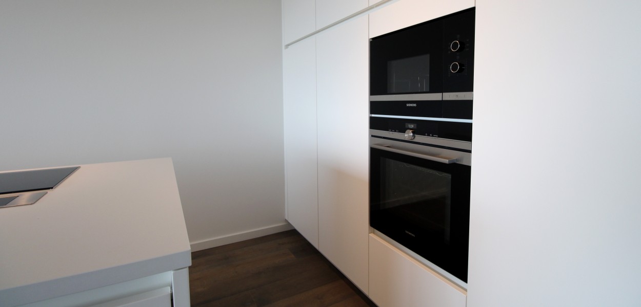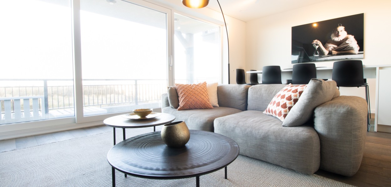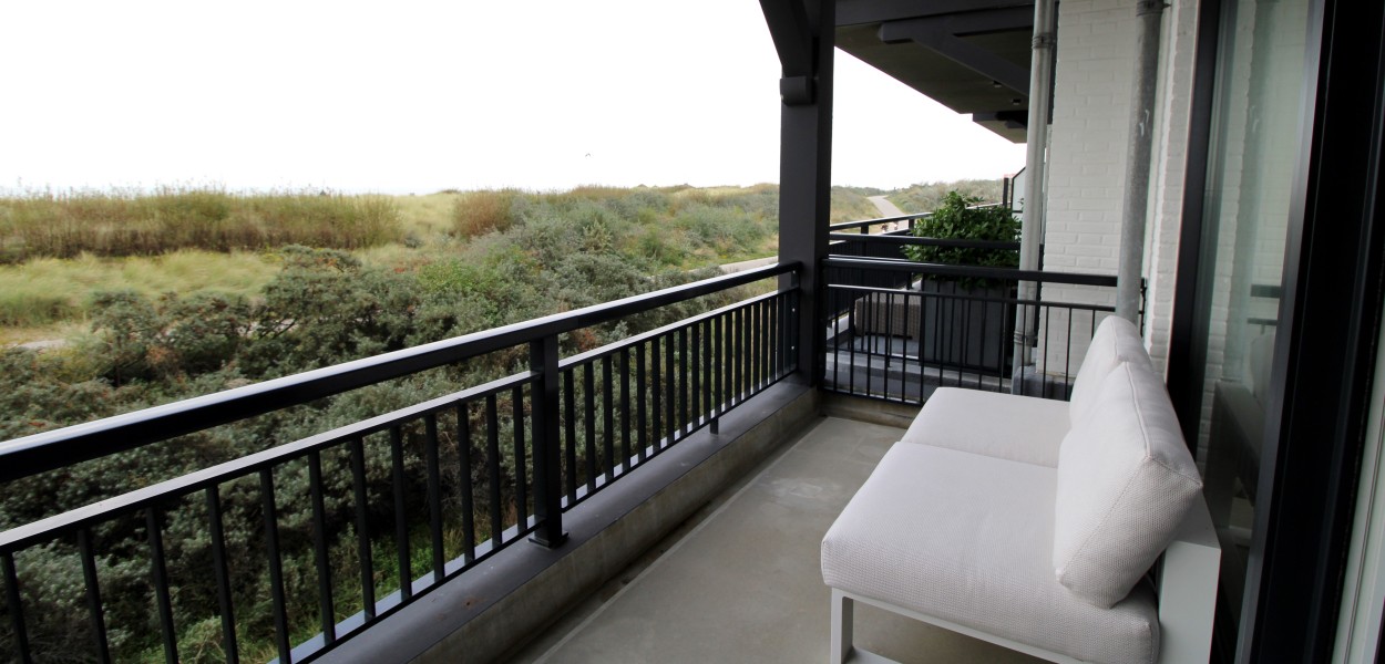 In het woongedeelte is een comfortabel zitgedeelte ingericht met meer dan voldoende zitplaatsen. Er is onder andere een televisie met uitgebreid digitaal zenderpakket. De open keuken is zeer modern en biedt behalve veel bergruimte alle benodigde apparatuur. Naast een inductiefornuis met werkbladafzuiging vindt u er ook een ingebouwde oven en magnetron, een koelkast met een vriesvak, een Nespresso-apparaat en een vaatwasmachine. In het verlengde van het aanrecht is een eetgedeelte verwerkt met 6 zitplaatsen. Dankzij de grote ramen geniet u vanuit de woonkamer én het eetgedeelte van een fantastisch uitzicht over de duinen en de Noordzee. Middels de schuifpui betreedt u het balkon dat op mooie dagen eenvoudig bij het woongedeelte kan worden betrokken dankzij een comfortabele loungeset.